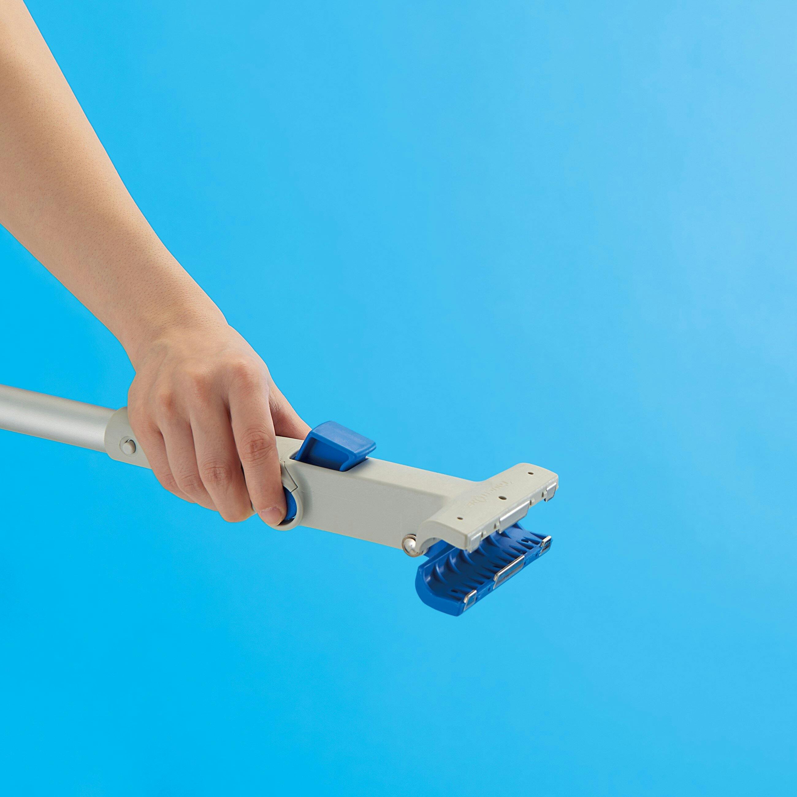 軽量で扱いやすいアルミハンドル。軽くボタンを押すだけでヘッドを固定。軽く両側のボタンを押すだけで、ヘッドを外せます。
