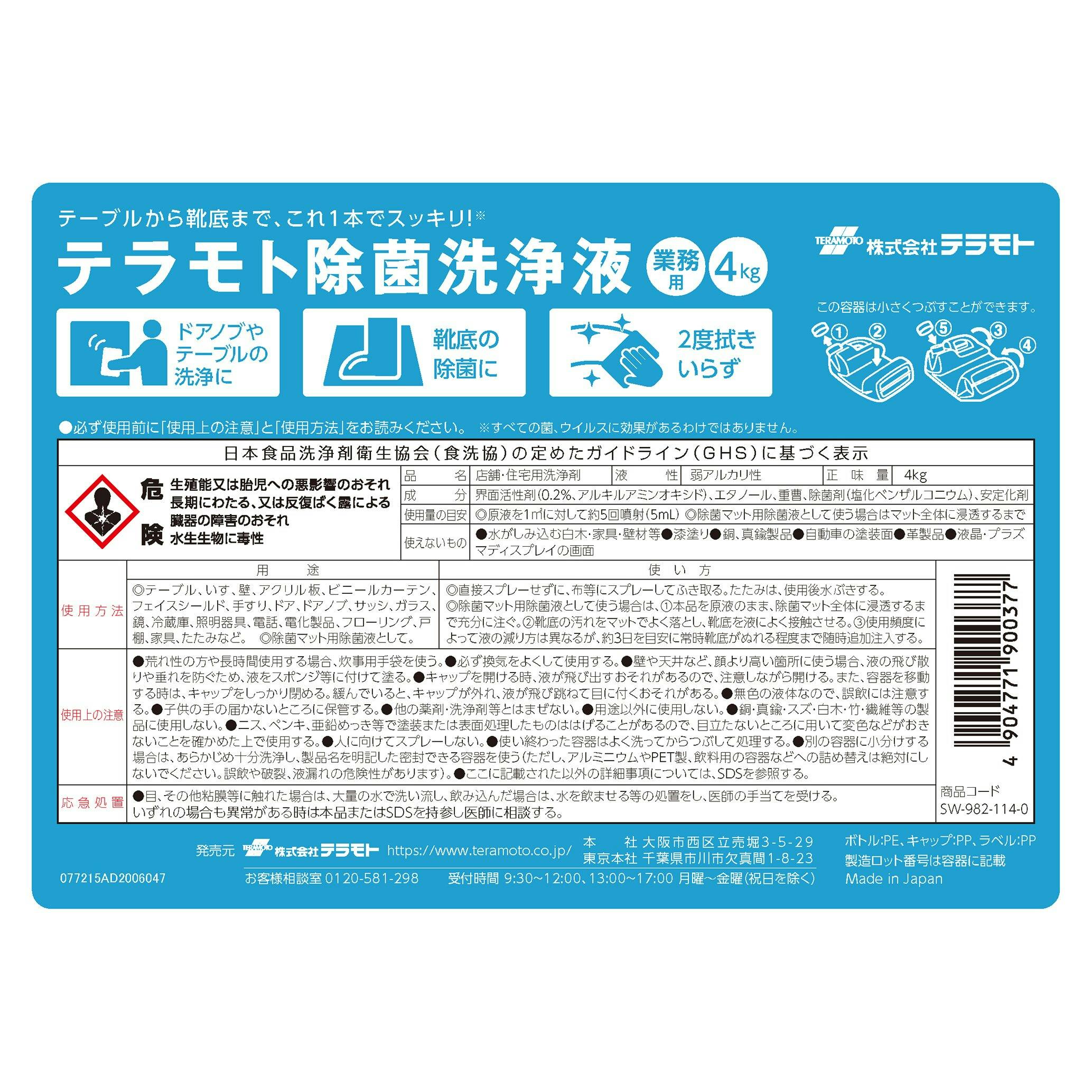 テラモト 除菌洗浄液4kg 感染対策商品 除菌剤 まとめ売り4本セット 【SW-982-114-0】 テラモト 備品 除菌 9999910027324【別送品】