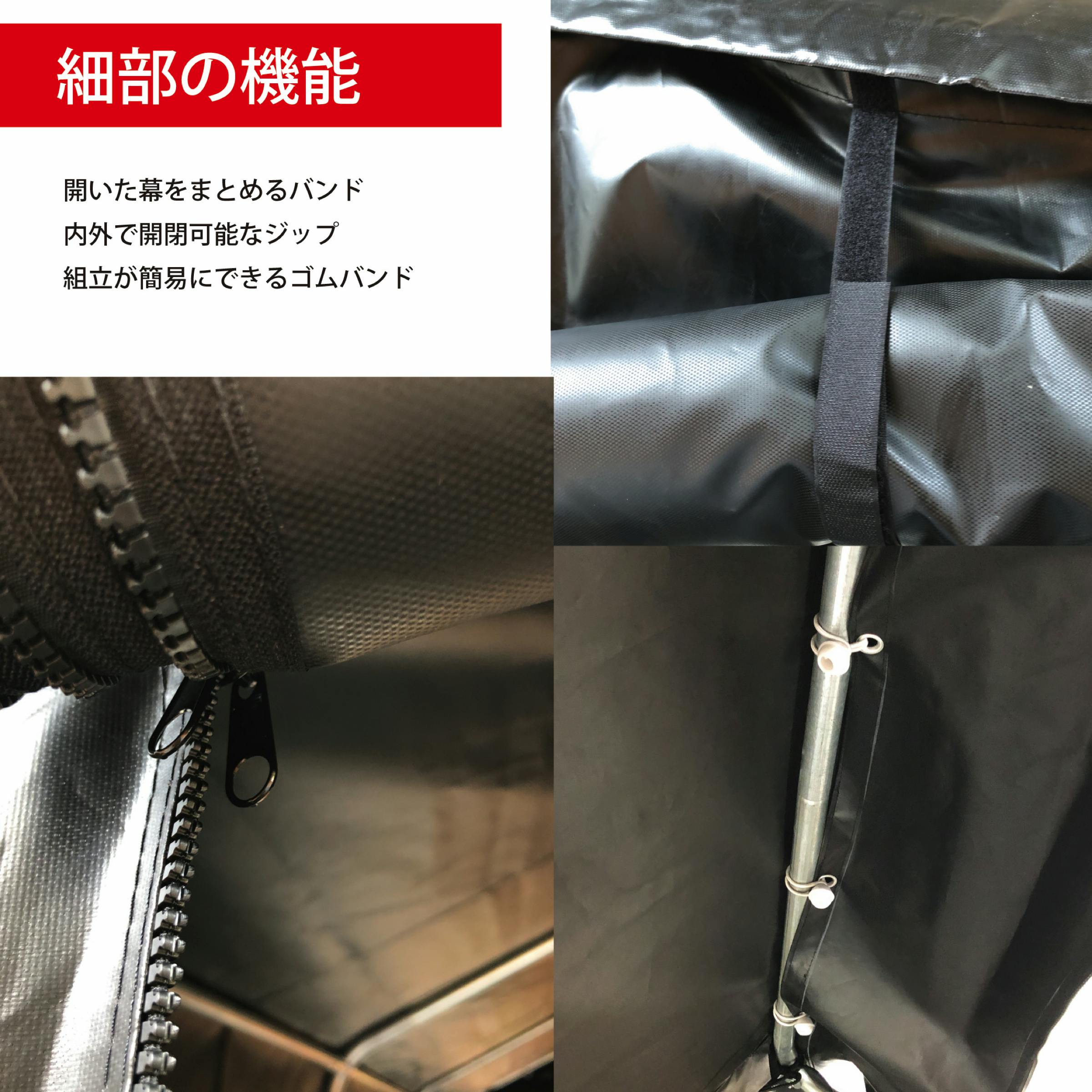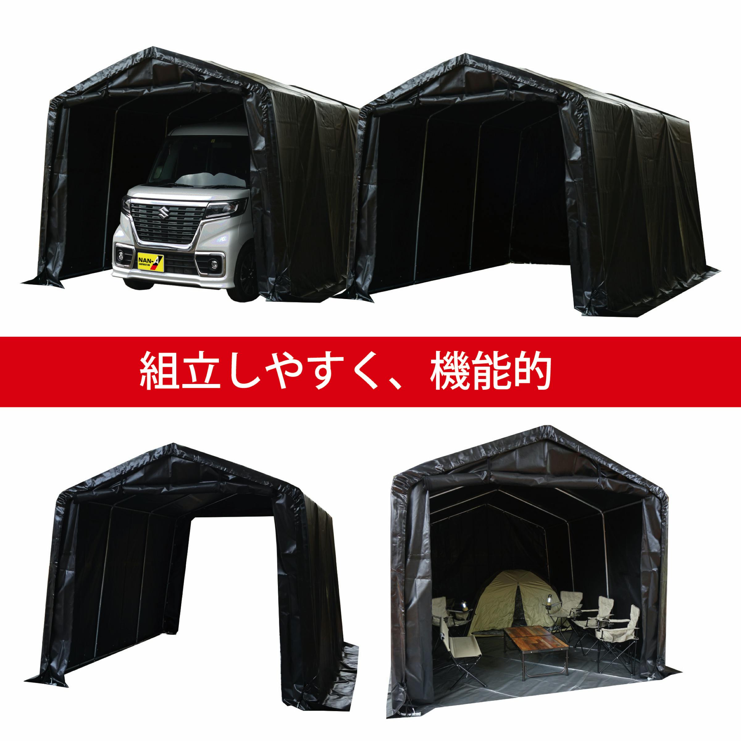 軽自動車対応 骨組は骨太33φパイプ(横通しパイプは25φ)仕様なので丈夫です。前後から出入りできる便利な仕様。隙間の少ないスカートタイプ