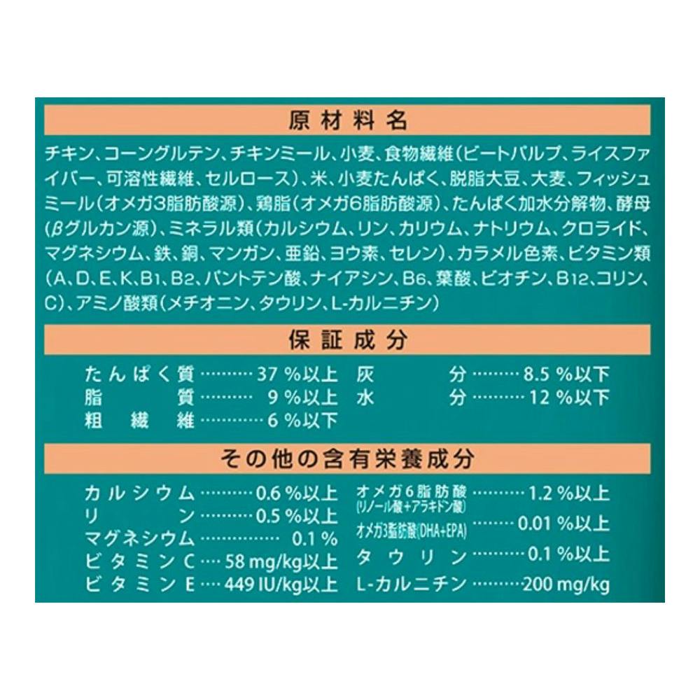 チキン、コーングルテン、チキンミール、小麦、食物繊維(ビートパルプ、ライスファイバー、可溶性繊維、セルロース)、米、小麦たんぱく、脱脂大豆、大麦、フィッシュミール(オメガ3脂肪酸源)、鶏脂(オメガ6脂肪酸源)、たんぱく加水分解物、その他