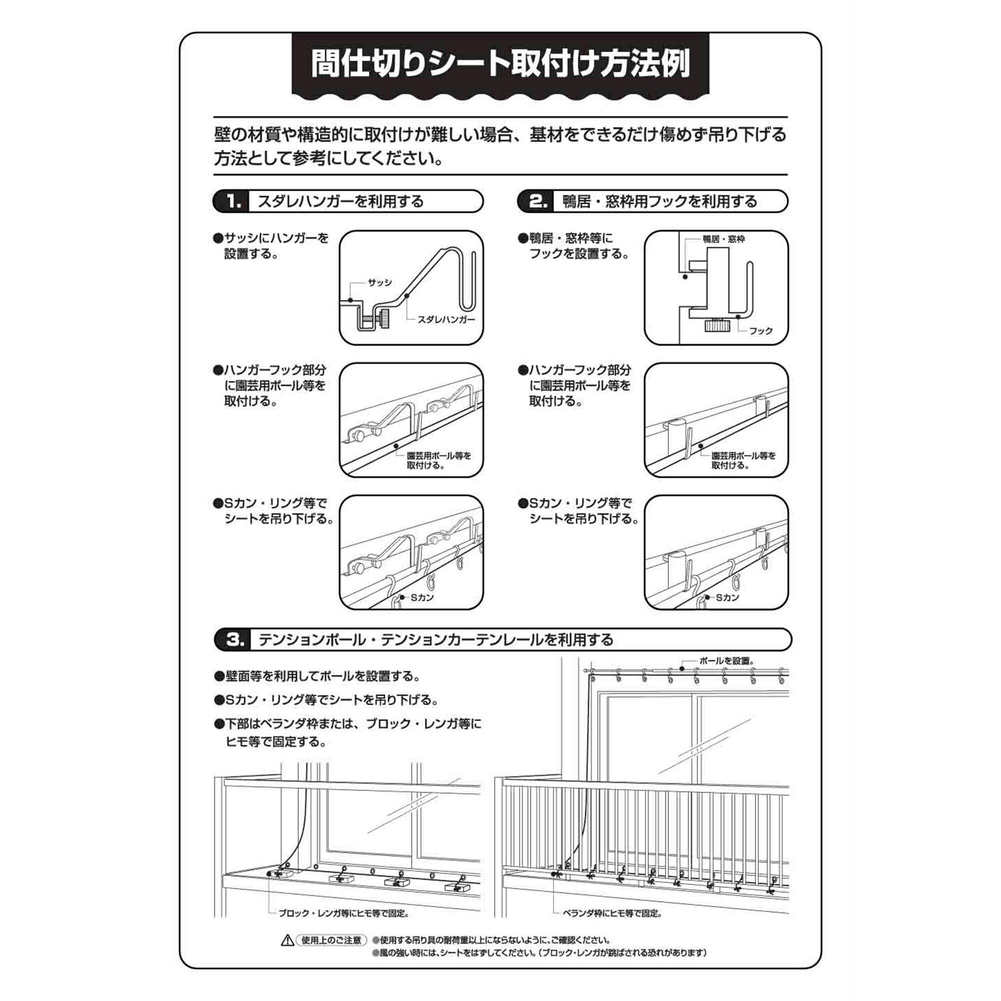 ・風が強い日時は使用を避け、取り外し安全な所に保管してください ・火のそばでは使用しないでください。(耐熱温度60℃)