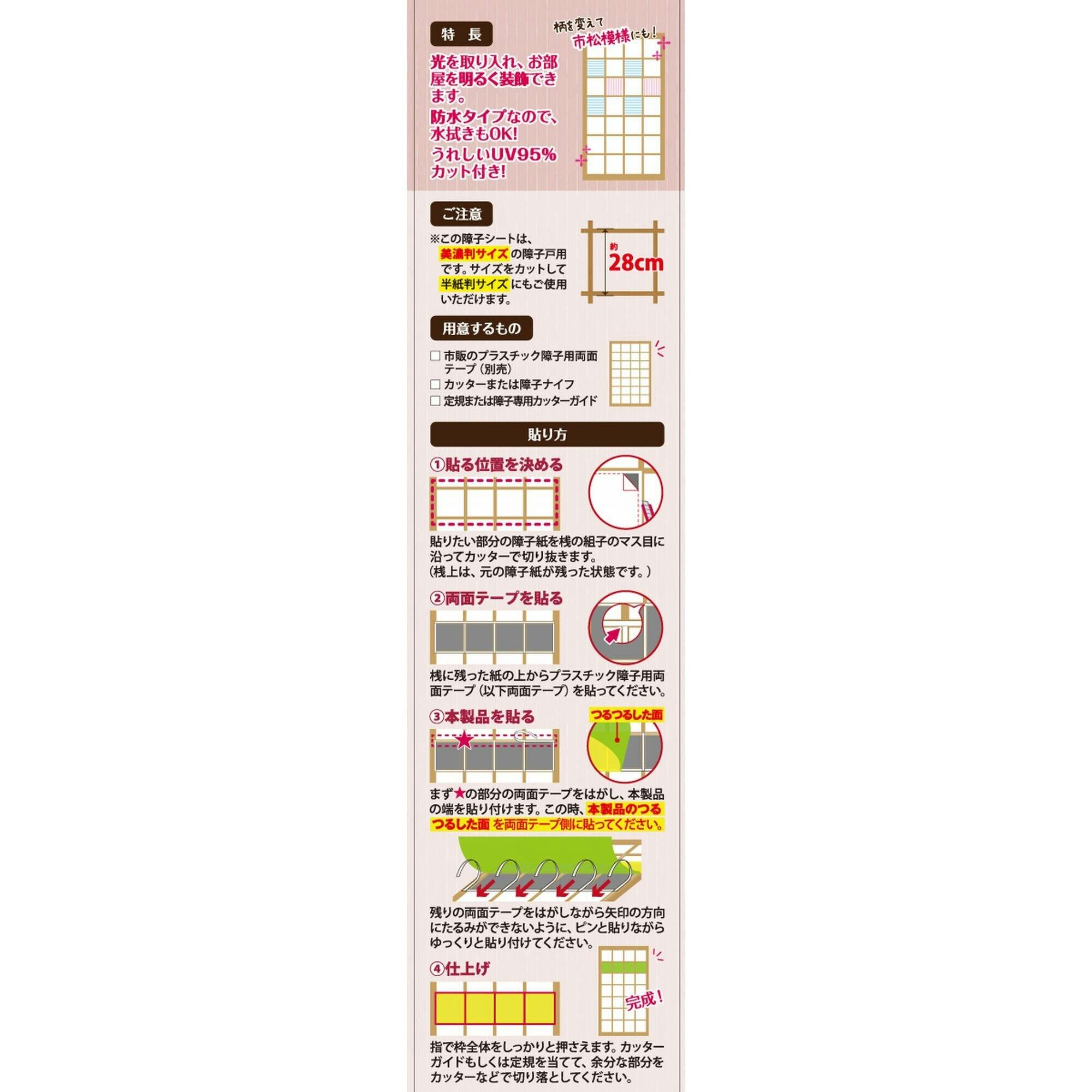 ・光を取り入れお部屋を明るく装飾! ・光の反射でキラキラ光る! ・UVカット率95%で日差しによる家具、カーペット、お肌の日焼けを防止します。 ・防水タイプで水拭きOK ・プラスチック障子用両面テープで貼って下さい。(別売)