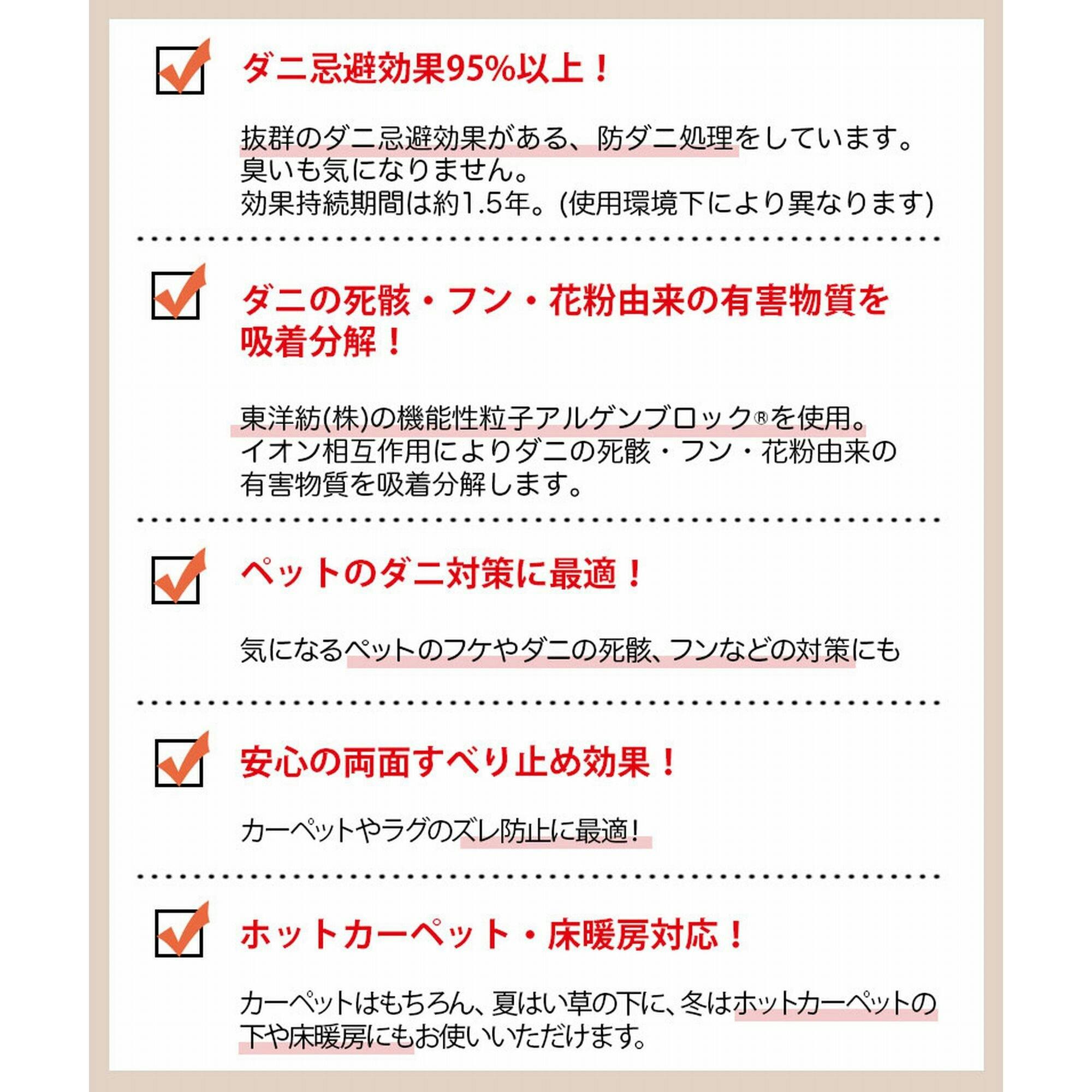 ・ダニ忌避効果95%以上! ・ダニの死骸、フン、花粉由来の有害物質を吸着分解! ・ペットのダニ対策に最適! ・安心に両面ズレ防止効果! ・ホットカーペット、床暖対応!