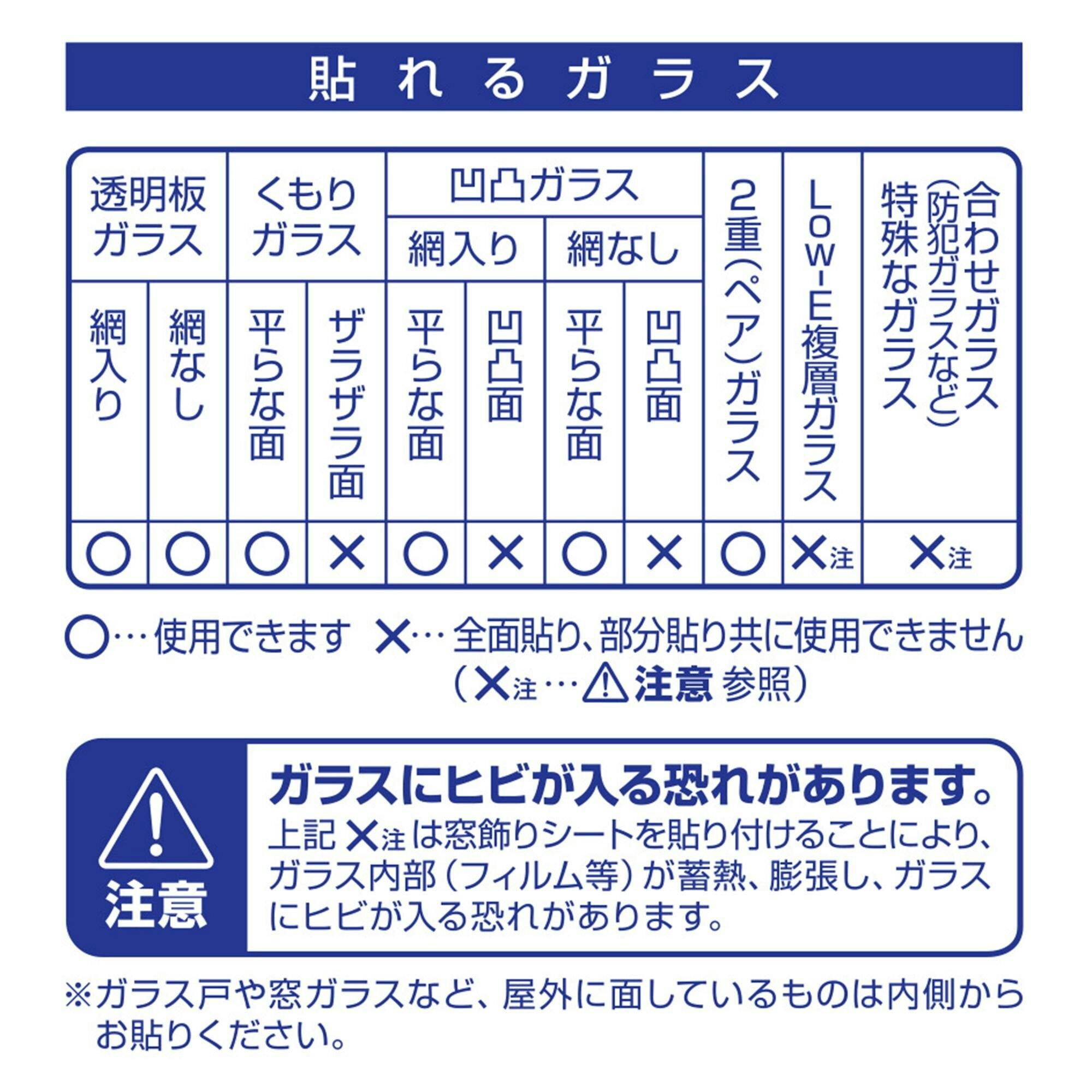 ・ペア、網入りガラスにも貼れる! ・飛散防止効果あり!台風対策! ・網入りガラスにもご使用いただけます。 ・粘着剤を使わずに吸盤効果で貼る装飾シートです。 ・UV(紫外線)99%カット配合ですので、畳や絨毯などを日焼けによる変色から守ります。