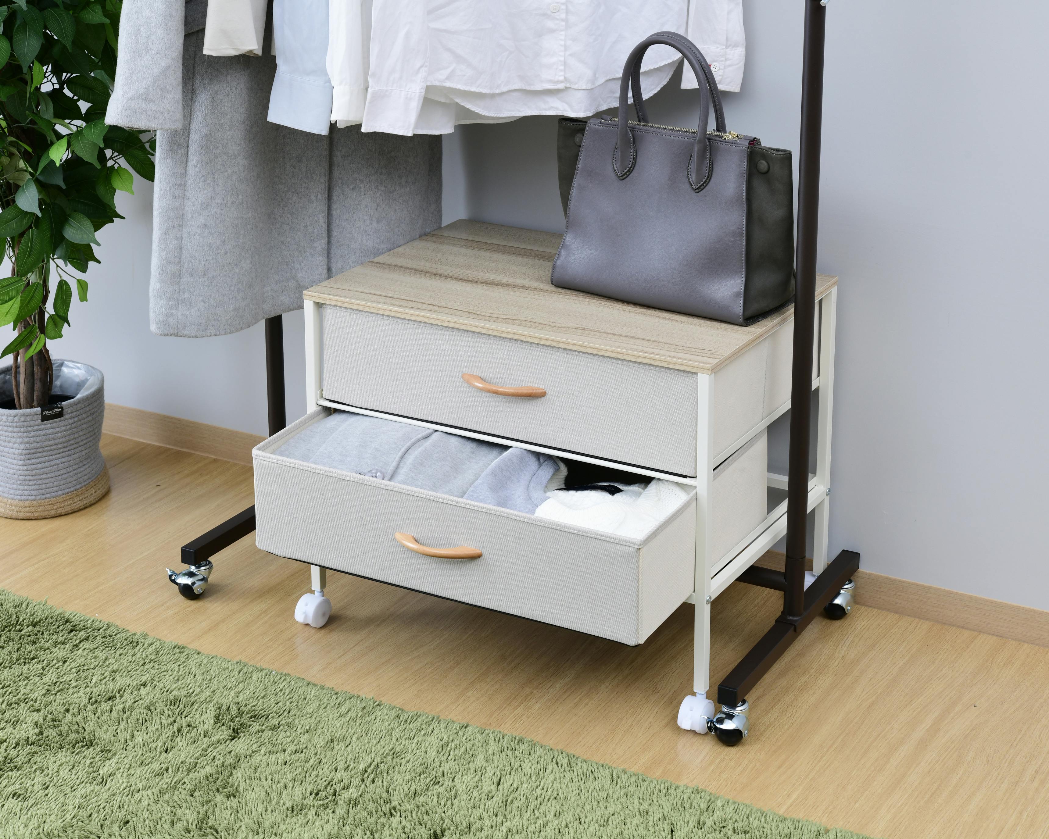 ●【木製天板】天板は木製なのでゆがみにくく、おしゃれな印象に。バッグや衣類小物などをを置くことができます。●【コスパの良さとおしゃれの両立】普段見える引出し前面はファブリック生地と木製取っ手をあしらい、見えない面は不織布を使用することで、コスパよく、かつ見映えよく仕上げています。