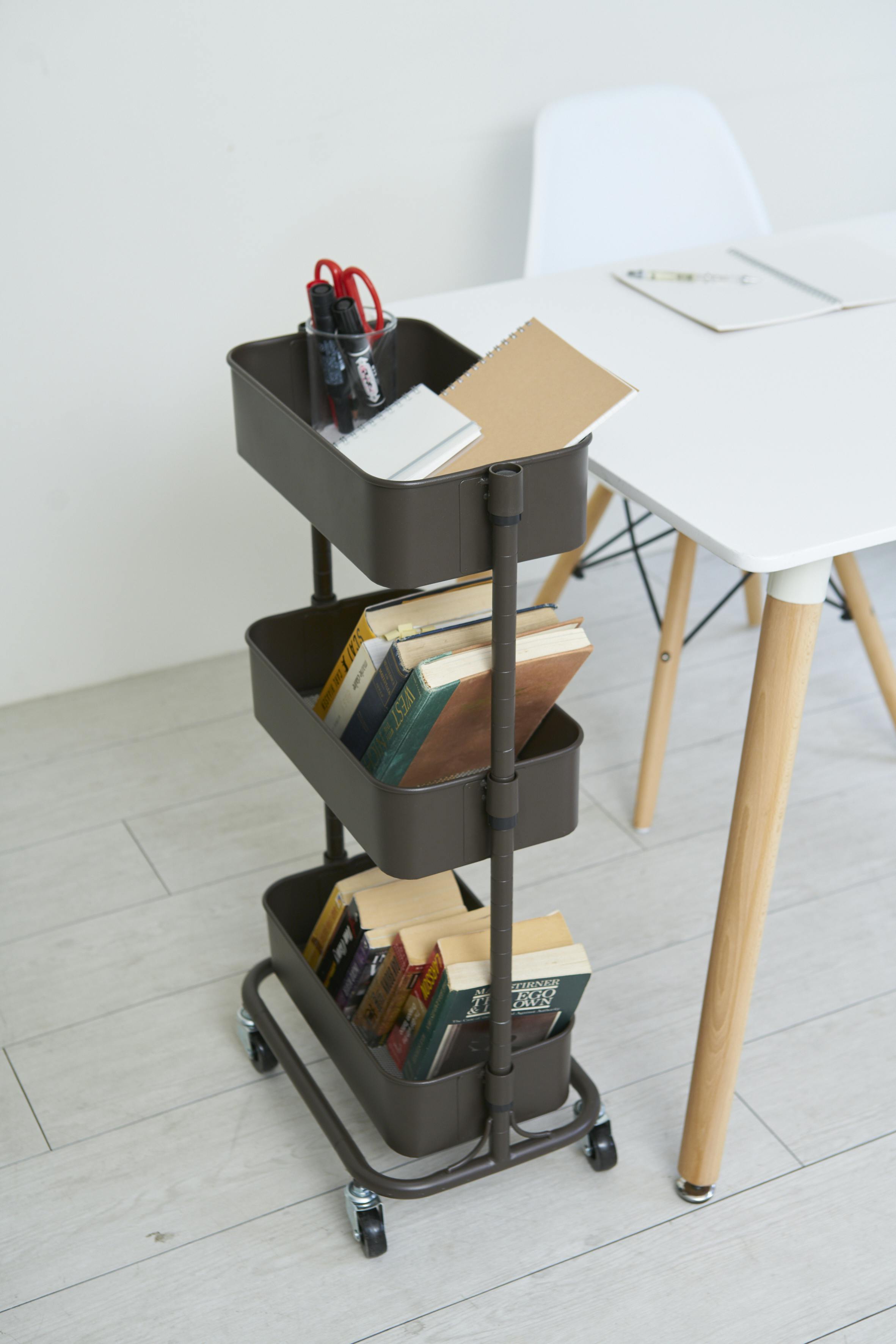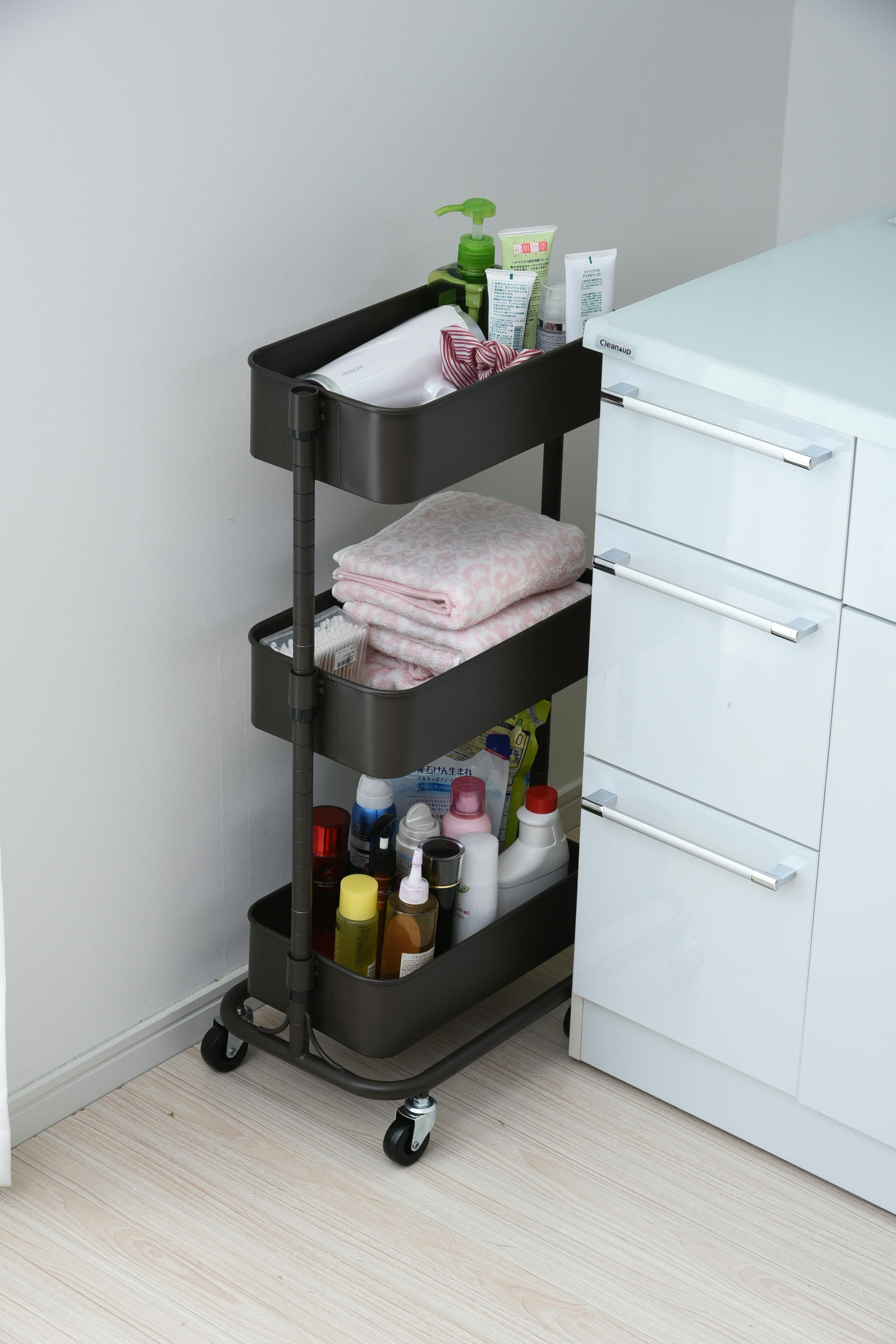●3つのバスケットはモノに合わせて、2.5cm間隔、24段階で高さを選んで設置可能。 ●バスケットの底は、細かい網目なので小さなアイテムも安心。スムーズなキャスターで、うちの中をスイスイ移動。●表面はツヤ消しでざらつきもあるマット仕上げ。