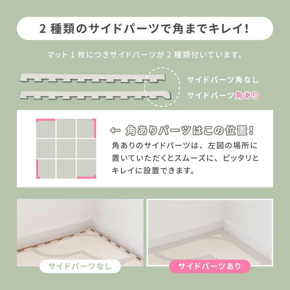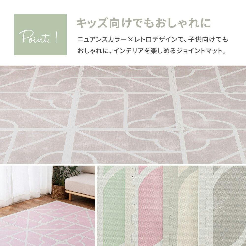 ニュアンスカラー×レトロデザインのジョイントマット。大きさのアレンジが出来て、洗えて防音対策になるというジョイントマット。おしゃれなアイテムが少ない中、デザインにこだわって開発した商品です。1セットで約2帖、3セットで約4.5帖、4セットで約6帖のサイズ感。●商品の特長・仕様に関する詳細は各メーカーホームページでもご覧頂けます。