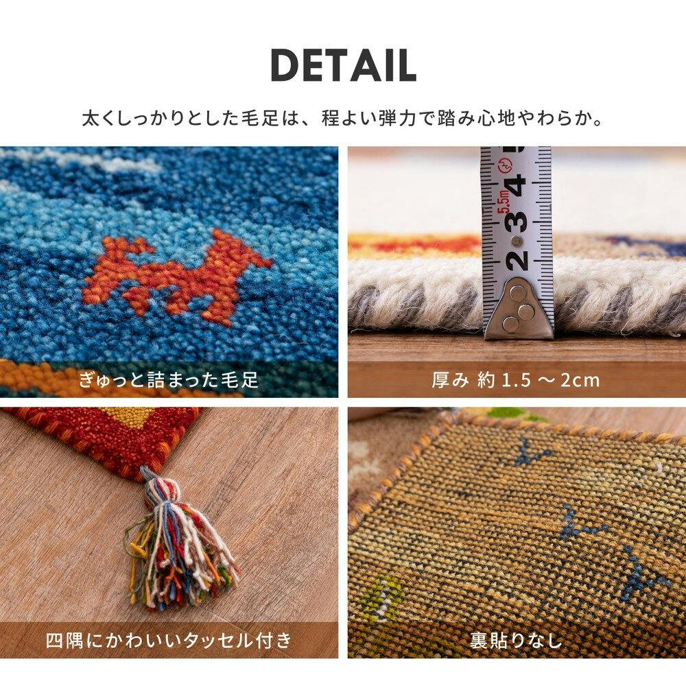 丁寧な手織り手法で使用時間の経過とともに味わいが深まる「ギャッベ」。ウール素材は暖かく冬に適しているイメージがありますが、温度差の激しい環境で育った羊から取れる羊毛(ウール)は、保温性と湿度を調節する機能に優れています。夏の湿気にも適しておりオールシーズンご使用いただける素材です。しっかりとした密度&厚み約2cm。ふかふかの座り心地をお楽しみいただけます。裏面も同素材で床にやさしい仕様です。四隅にはフリンジをあしらい、愛らしさをプラスしました。