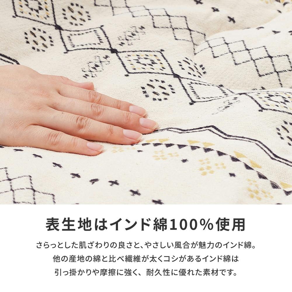 側生地はインド綿100%のジャガード織の生地。プリントではないので表情も豊か。中材はシート状の綿を使用。重量感もあり、すき間のできにくい布団に仕上がりました。●商品の特長・仕様に関する詳細は各メーカーホームページでもご覧頂けます。