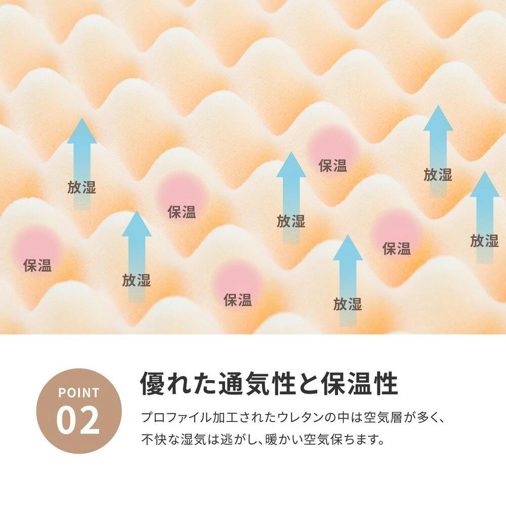 敷き布団いらず、これ1枚で上質の眠りを。安心と信頼の日本製ウレタンを使用した、高反発マットレス。ほどよい弾力で寝返りをアシストし、優れた通気性と保温性で快適な眠りを促進。カバーの表生地はスムース生地、裏生地はメッシュを採用。スムース生地は年中、メッシュ生地は暑い夏場にオススメです。カバーはL字ファスナーで脱着可能なので、外して洗濯が可能です。●商品の特長・仕様に関する詳細は各メーカーホームページでもご覧頂けます。