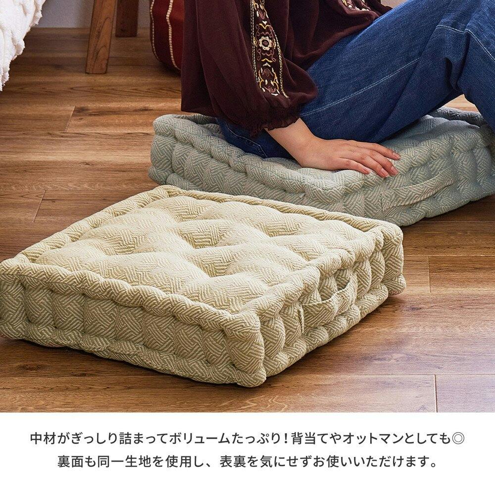インド綿ならではのやさしい風合いが魅力のシートクッション。裏面も同一生地を使用。適度な厚みで、お尻を優しくサポート。椅子以外にも、床やソファ、車のシートなど様々な場所で活躍。●商品の特長・仕様に関する詳細は各メーカーホームページでもご覧頂けます。