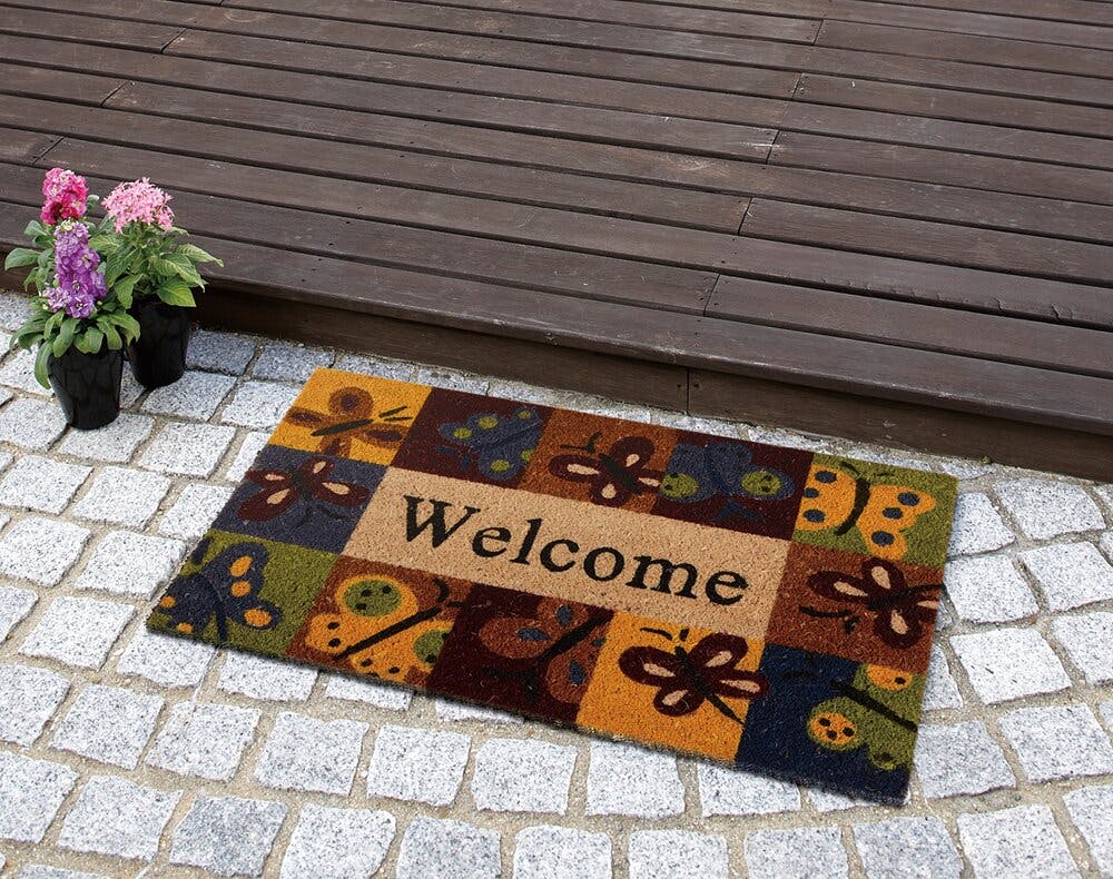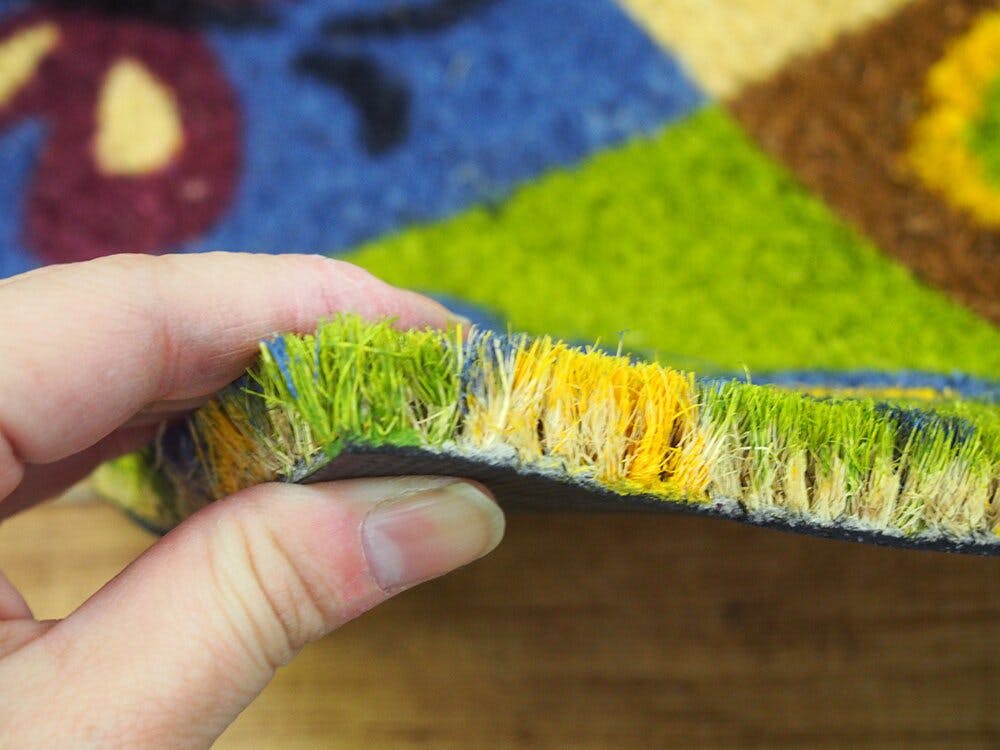 機能性とデザイン性の両方を兼ね備えた屋外用玄関マット。ココナッツ繊維素材がしっかり泥を落としてくれます。下地が見えないほどコイヤーをしっかりつめました。厚みは、約1.5cmです。裏面は、ラバー素材を使用しています。