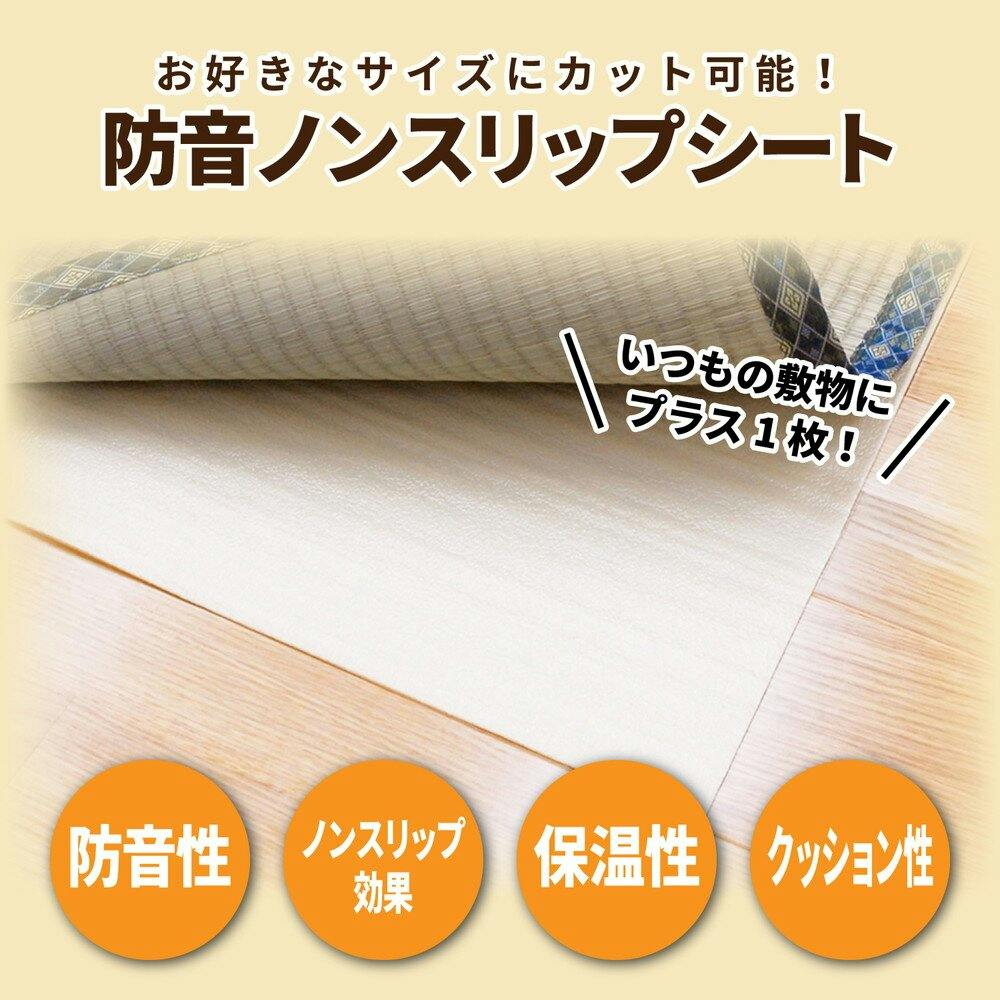 一枚で、防音・滑り止め・保温・クッション性の効果をあわせもった敷物シートです。<br>お好きなサイズに、ハサミなどでカットできます。敷物より大きくはみ出す場合は切って、小さい場合は複数枚組み合わせてお使いいただけます。<br>接着剤を使用していないので、ホルマリンなどの揮発性有機化合物(VOC)の発生なく、安心してお使いいただけます。<br>ラグ・カーペット・上敷き・絨毯・キッチンマット・玄関マット・トイレマットなど敷物全般にご使用いただけます。