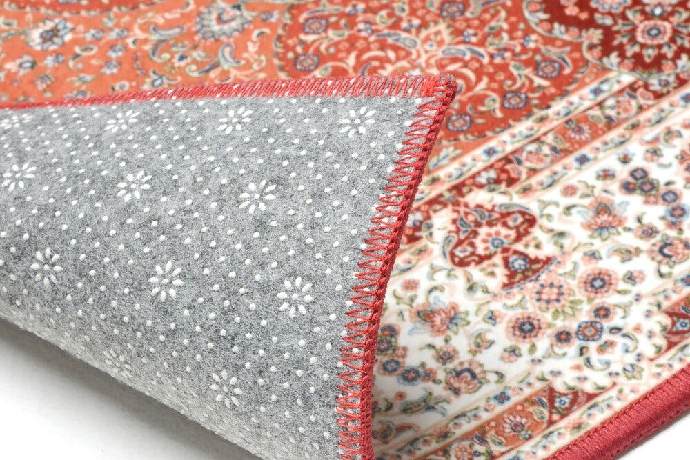 洗える転写プリントマット。遠くから見ると繊細な柄は、近くで見るとカクカクとしたおもしろデザイン。<br>さらさらした肌触りの良い感触とお手入れのしやすさが魅力です!洗濯機で洗えるので清潔にお使いいただけます。<br>裏面は、不織布の上に滑りにくい加工を施しています。ドット柄の滑り止めに、強力な花柄の滑り止めをプラスしました。