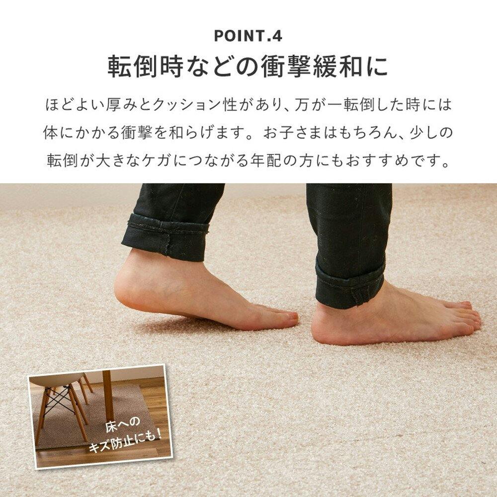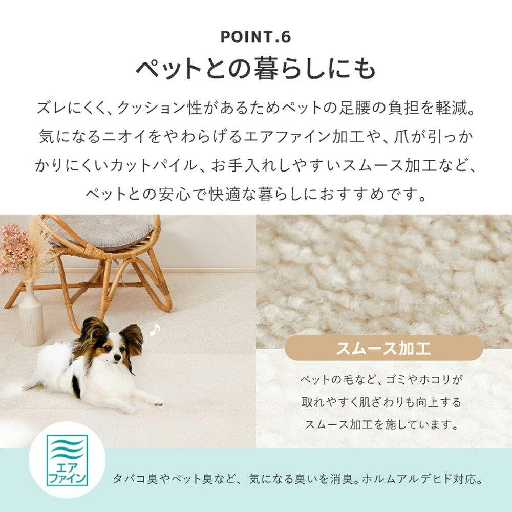 やわらかくしっとりとした肌あたりで、いつでも触れていたくなるような心地よさ。上質感のある光沢とたっぷりとしたボリュームで、ラグジュアリーな空間を演出します。裏面は吸着加工でズレにくく、床に置くだけなので施工は簡単。はっ水・防汚加工で汚れにくく、汚れてもその部分だけ取り外して手洗いできるので、いつも清潔にお使いいただけます。気になるニオイをやわらげる「エアファイン」加工付きです。