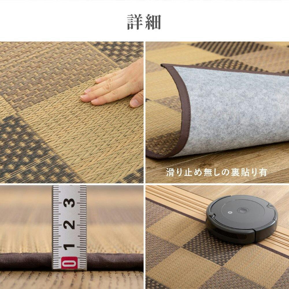濃いめの染めい草を使った和モダンでおしゃれな市松柄のい草カーペット。お部屋のラグとしてや、畳を保護する上敷きとしてなど使い方は様々。裏面に不織布を貼っているため床が傷つきにくくフローリングなどの洋室におすすめです。
