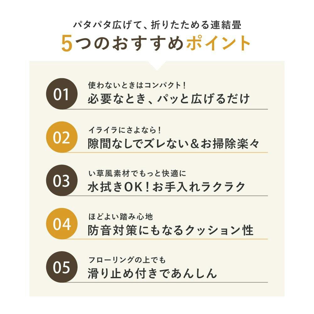 ズレるイライラから解放!置き畳同士を繋ぎ合わせたから隙間にゴミが溜まりにくく、コンパクトに折りたためるから収納も掃除もらくらく。使いたいとき、パッと広げるだけで簡単に畳スペースがつくれます。パイプ状にした樹脂素材を、い草と同じように織り上げた『い草風』の畳で、水に強くジュースなどをこぼしてもさっと拭き取れるから汚れても安心。子どもやペットのいるご家庭におすすめです。