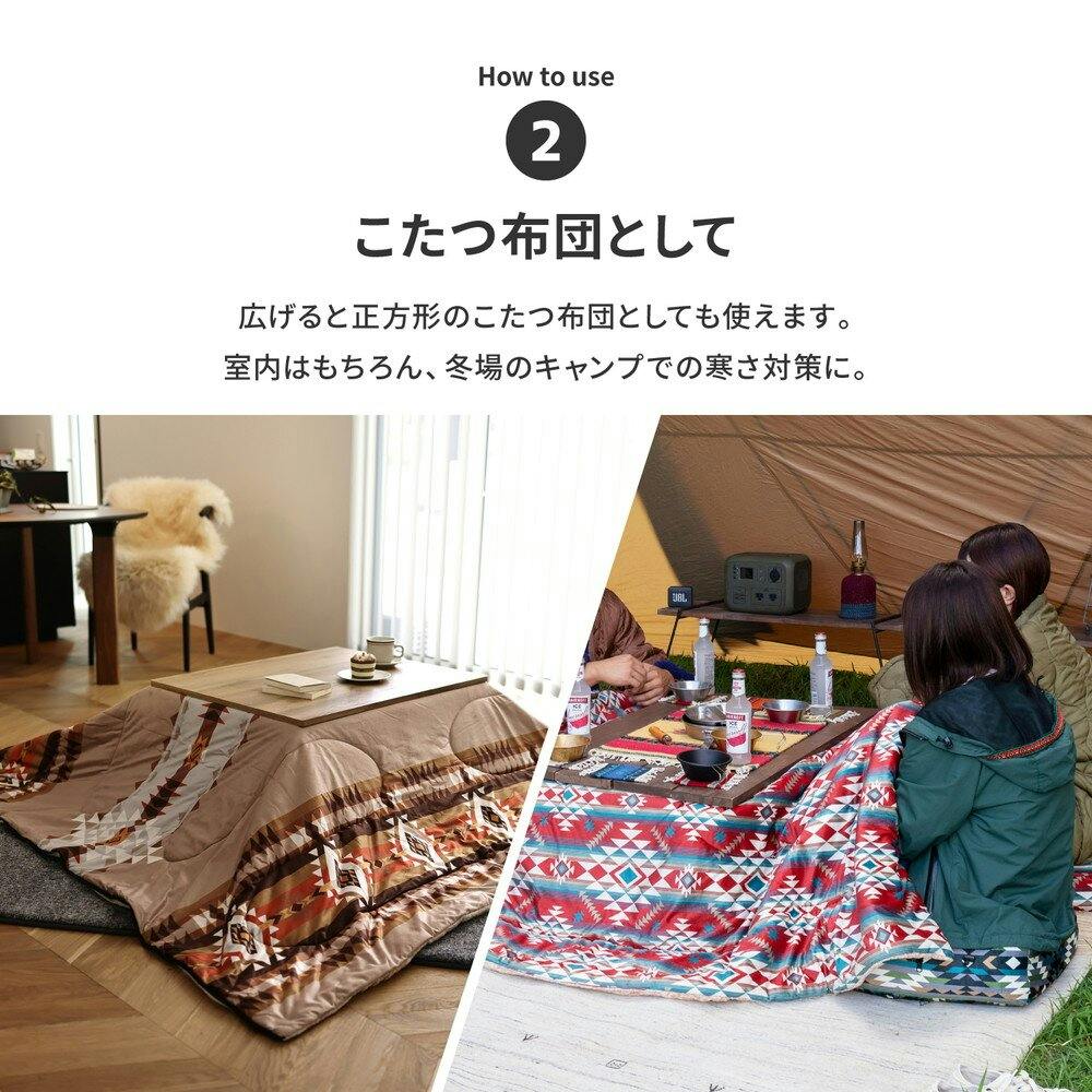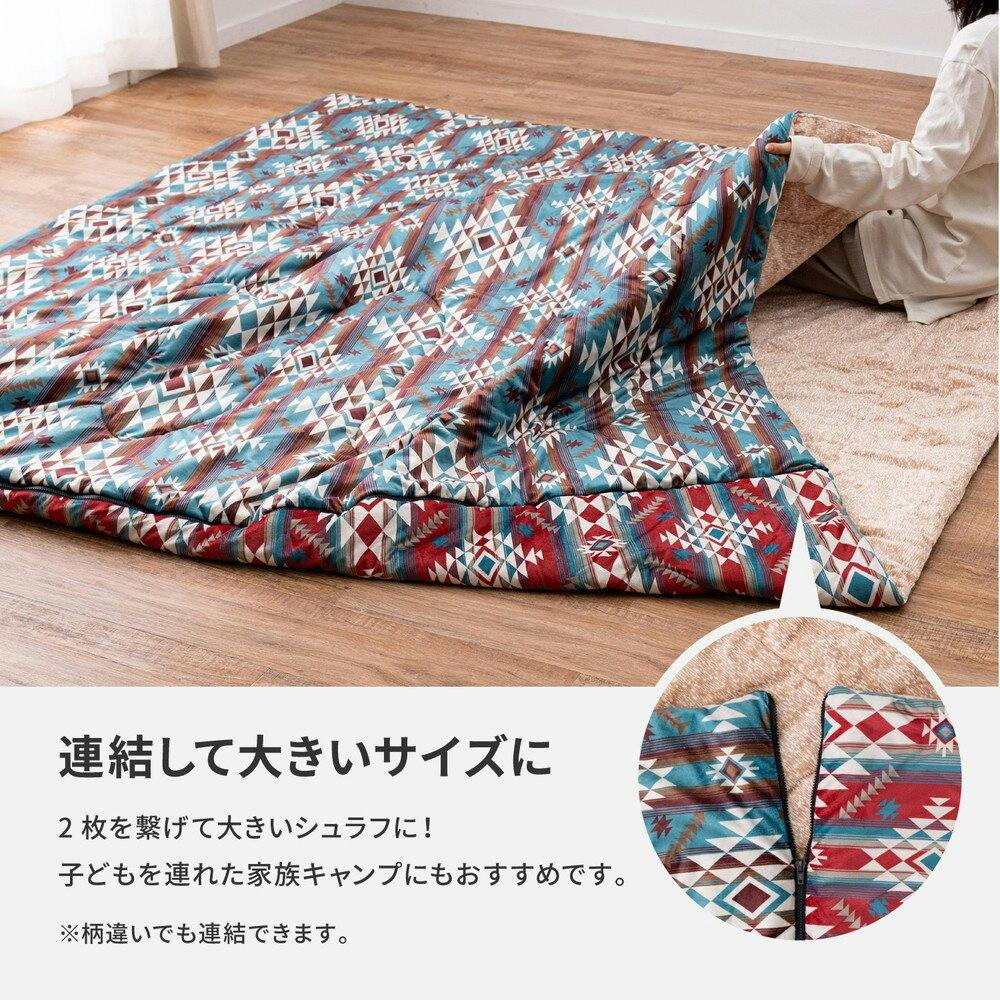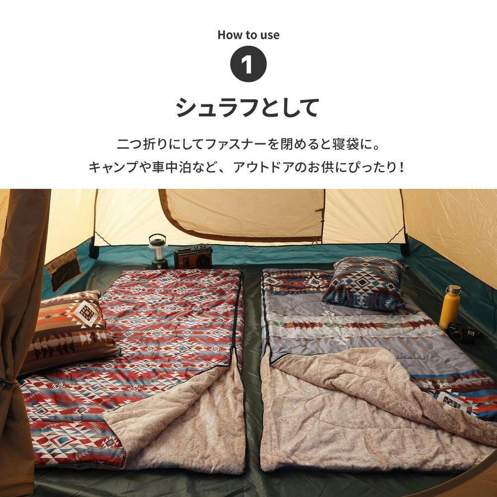 アウトドア感満載な3WAYクッションシュラフ。 中身を収納すればクッション、中身を出せばシュラフ、こたつ布団の3通りの使い方ができます。 外のキャンプはもちろん、お家の中でもアウトドア気分を盛り上げます。 コンパクトなクッションの状態でお部屋に置いておけば、緊急時でも簡単に持ち出せます。