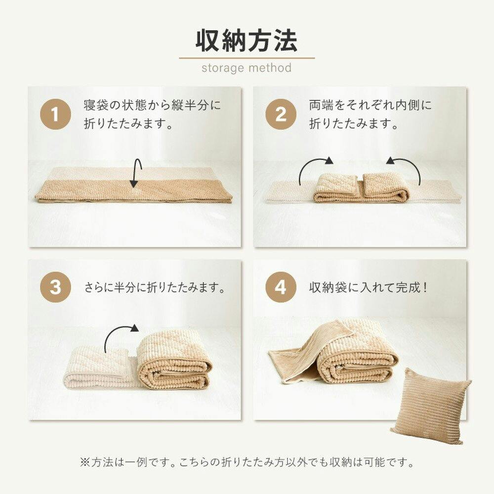 表と裏、どちらもフランネル素材を使用し、ふんわりやさしいなめらかなタッチ感。オフシーズンなど使わない時にも、クッションとしてリビングや車に置いておけるから収納場所にも困りません。また、身近なところに置いておくことで災害などの緊急時にもサッと持ち出せるから便利で安心。洗濯機で丸洗いできるため、汚れも気にせずお使いいただけます。