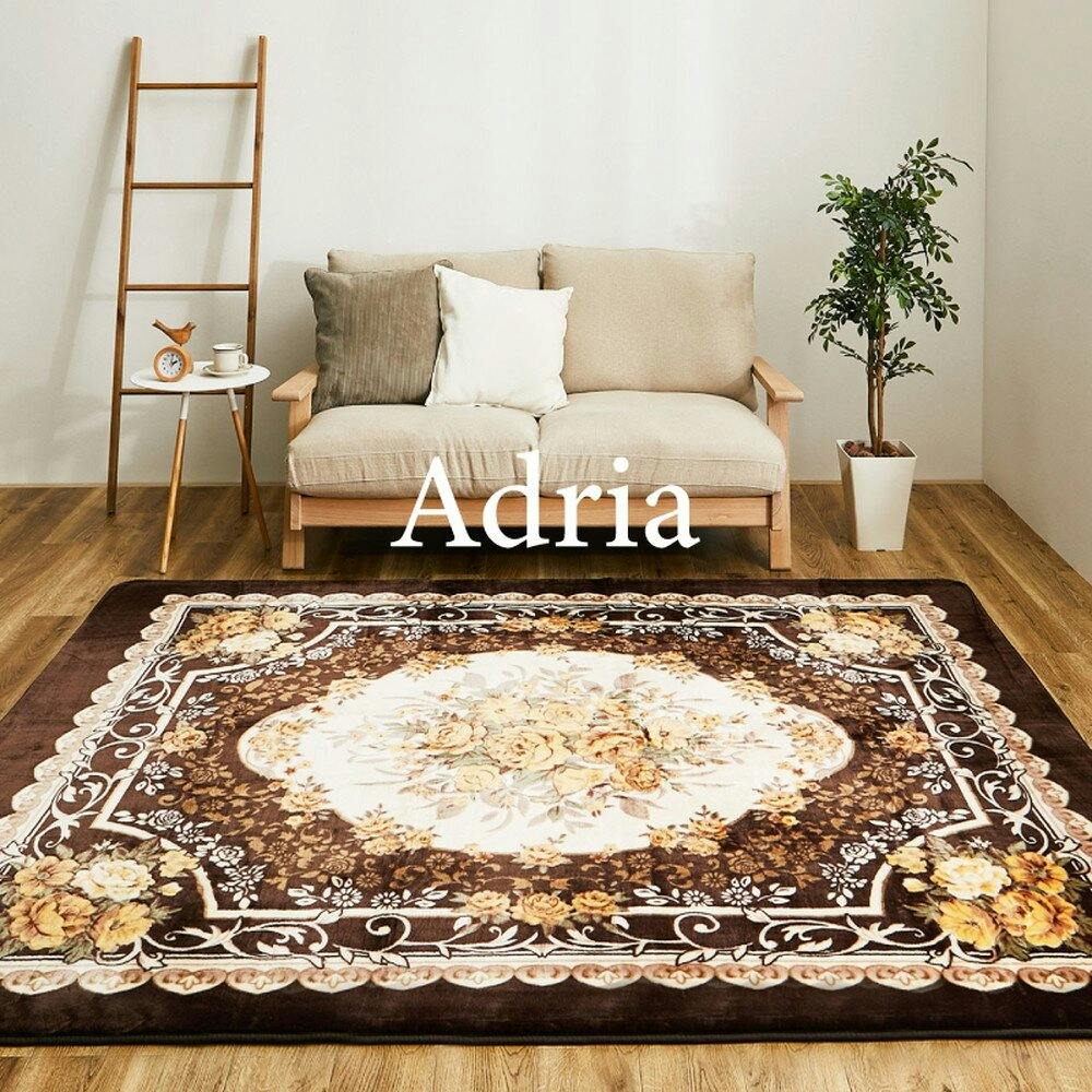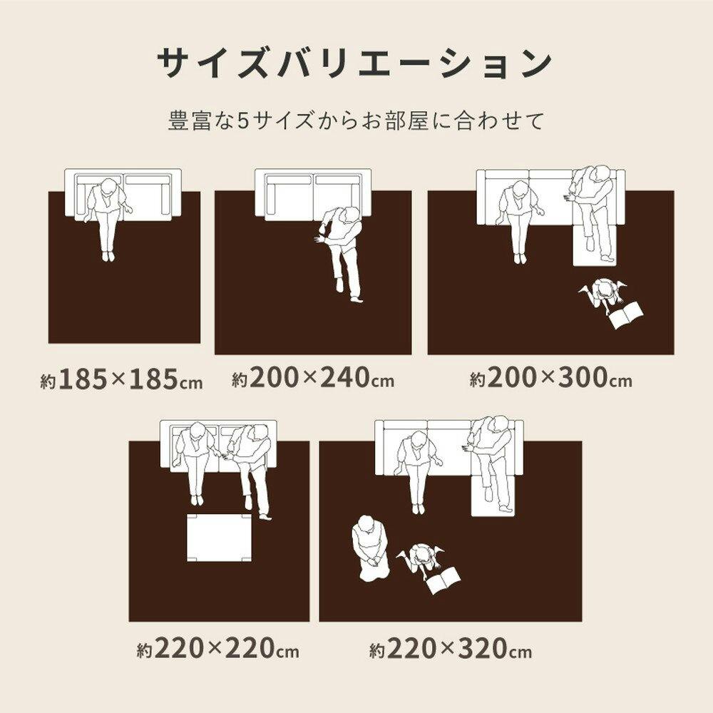 部分的に施されたカービング加工によって立体感が生まれ、高級感のある仕上がりになっています。ウレタン入りでふっくらと厚みがあり、そのまま寝転がったり座布団がなくてもからだが痛くなりにくく、やさしい肌触りで心地よく快適に過ごせます。そのままご使用いただいても暖かいですが、さらに暖かくお使いいただけるようホットカーペット・床暖房対応。裏面は滑り止め付きでズレにくいのもうれしいポイントです。