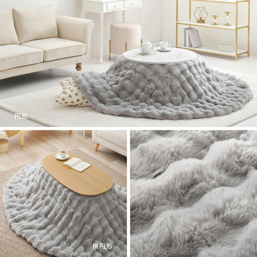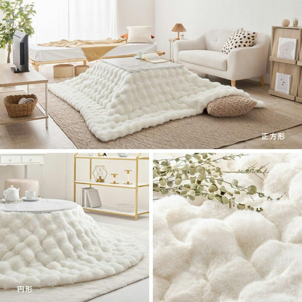 やさしく包み込むようなふわふわタッチに、ぽこぽことした見た目も可愛いおしゃれなこたつ布団です。かさばらずすっきりと使いやすい薄掛けタイプのこたつ布団ですが、たっぷりの中わた入りでボリュームがあり、ぎゅっと詰まった高密度な長毛パイルが空気を多く含み、あたたかさを保ち快適に。また、洗濯機で洗えるから汚れても安心、いつも清潔にお使いいただけます。