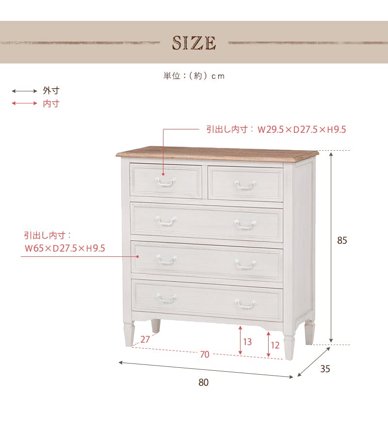 ■商品外寸サイズ:(約)幅80×奥行35×高さ85cm■内寸及び補足説明・ 引出内寸(小):(約)幅29×奥行27×深さ9cm・ 引出内寸(大):(約)幅65×奥行27×深さ9cm