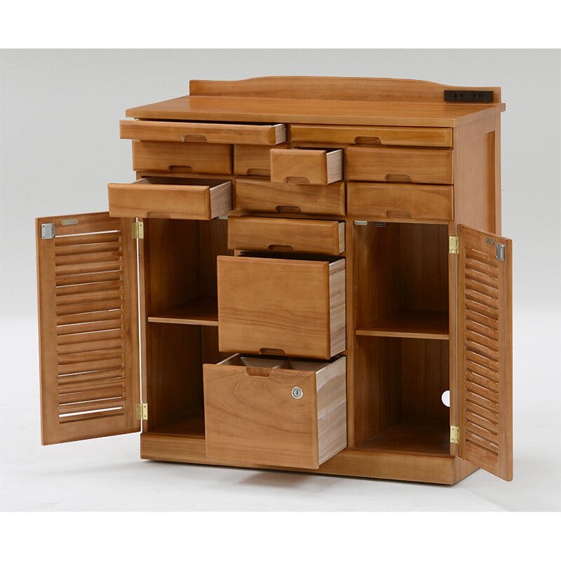 ■商品外寸サイズ:(約)幅76×奥行32×高さ83cm■内寸及び補足説明・ 引出内寸(1):(約)幅33×奥行26×深さ3cm・ 引出内寸(2):(約)幅9×奥行26×深さ5cm・ 引出内寸(3):(約)幅22×奥行26×深さ5cm・ 引出内寸(4):(約)幅22×奥行26×深さ18cm・ 扉内内寸:(約)幅21×奥行28×高さ48cm・ 可動棚:2枚・3cmピッチ3段階・ 2口コンセント付