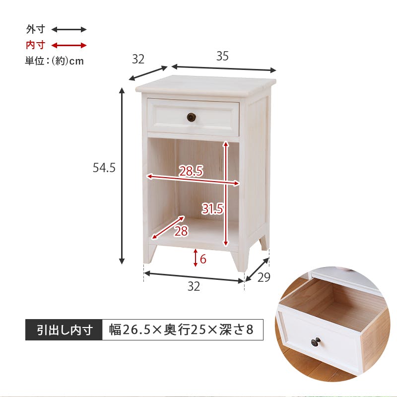■商品外寸サイズ:(約)幅35×奥行32×高さ54.5cm■内寸及び補足説明・ オープン部内寸:(約)幅28.5×奥行28×高さ31.5cm・ 引出内寸:(約)幅26.5×奥行25×高さ8cm