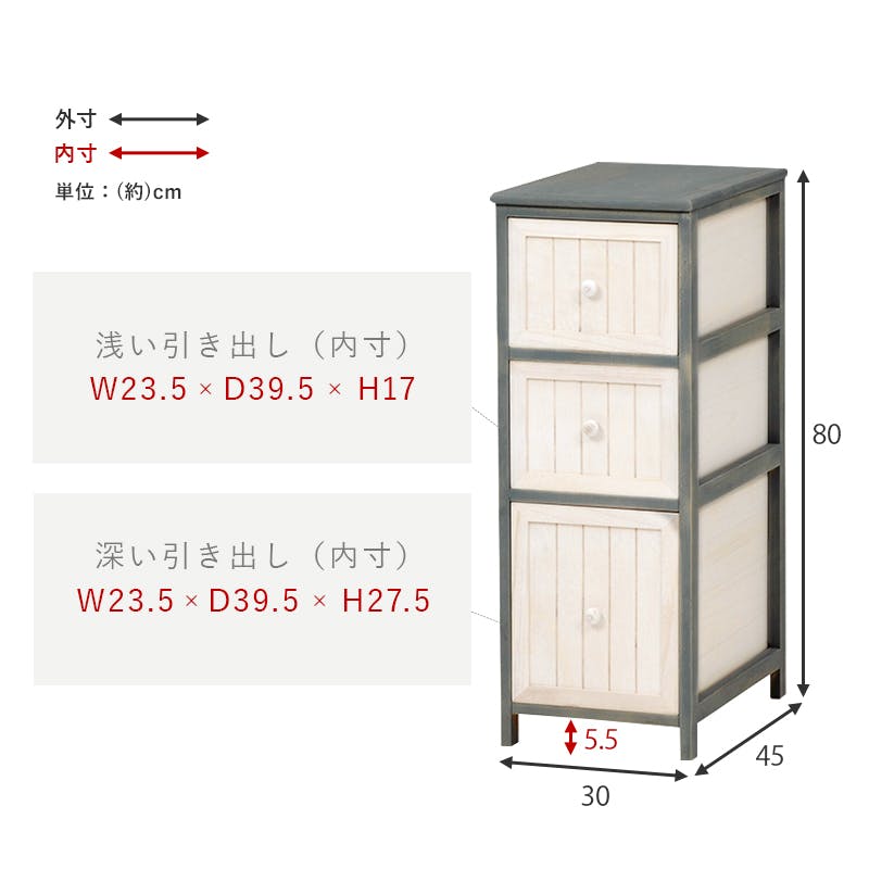 ■商品外寸サイズ:(約)幅30×奥行45×高さ80cm■内寸及び補足説明・脚高さ5.5cm・ 引出し内寸(小):(約)幅23.5×奥行39.5×高さ17cm ・ 引出し内寸(大):(約)幅23.5×奥行39.5×高さ27.5cm