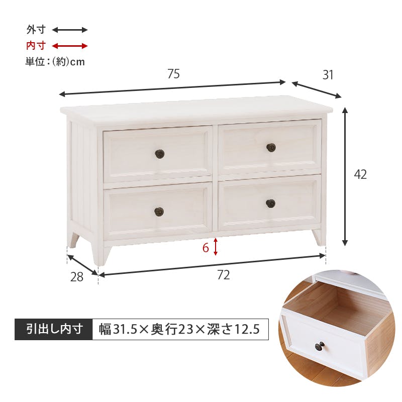 ■商品外寸サイズ:(約)幅75×奥行31×高さ42cm■内寸及び補足説明・引出内寸:約幅31.5×奥行23×深さ12.5cm