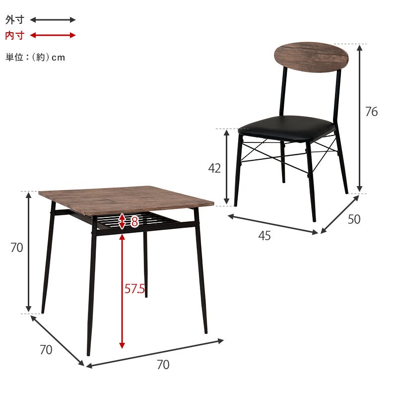 ■商品外寸サイズ:テーブル:(約)幅70×奥行70×高さ70cmチェアー:(約)幅45×奥行50×高さ76×座面高42cm■内寸及び補足説明・組立式
