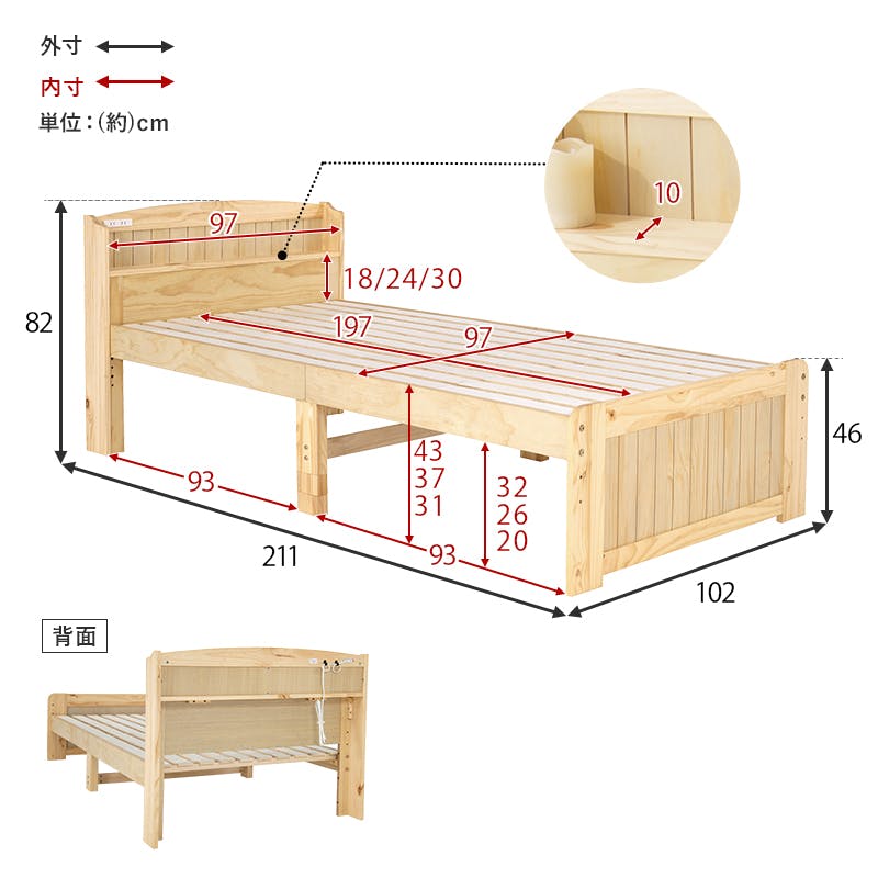 ■商品外寸サイズ:(約)幅102×奥行211×高さ82×床面高31/37/43cm■内寸及び補足説明・組立式・2口コンセント付