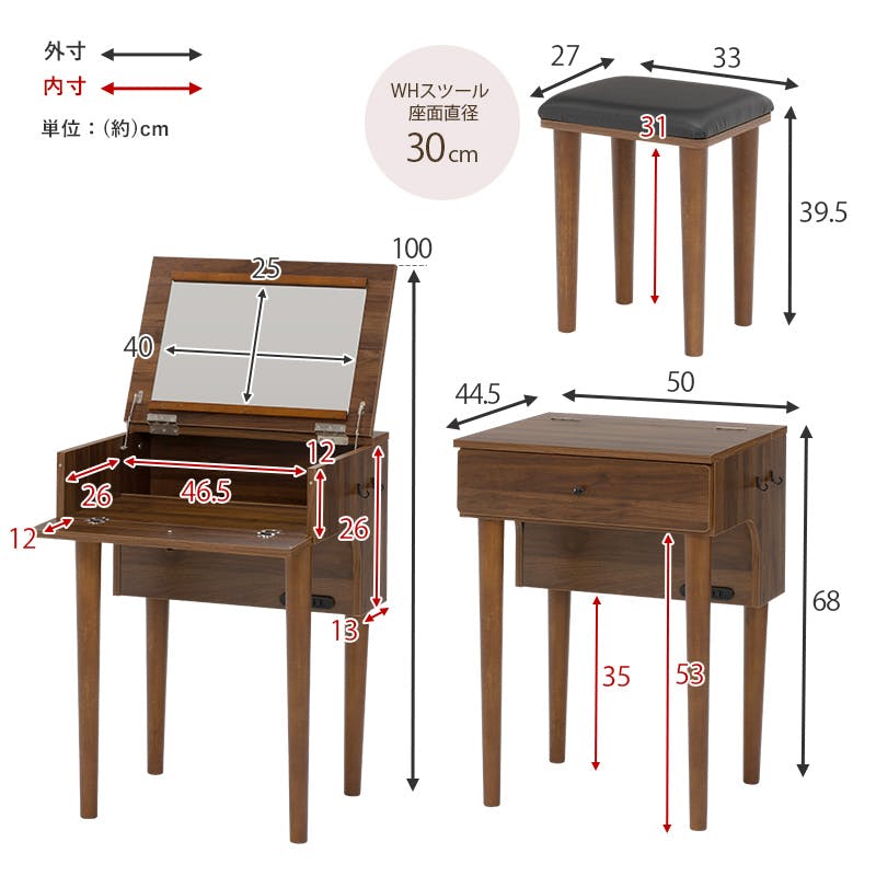 ■商品外寸サイズ:ドレッサー:(約)幅50×奥行61/44.5×高さ100/68cmスツール(ダークブラウン):(約)幅33×奥行27×高さ39.5cmスツール(ホワイト):(約)幅φ30×高さ39.5cm■内寸及び補足説明・組立式