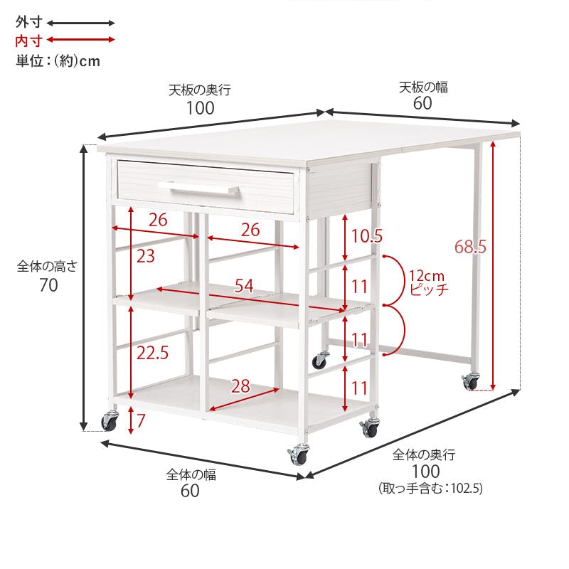 ■商品外寸サイズ:(約)幅60×奥行42/100(取っ手含む44.5/102.5)×高さ70cm■内寸及び補足説明・組立式・キャスター付・可動棚×2枚