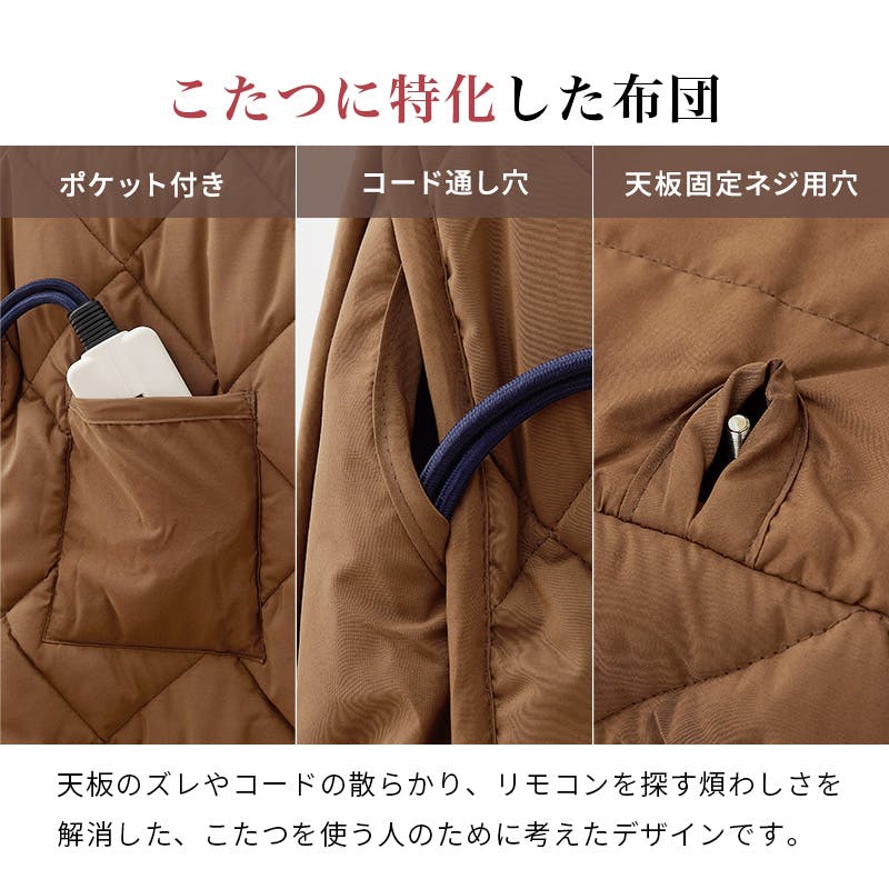 こたつ:<天板>天然木化粧繊維板<脚部>ラバーウッド<表面加工>UV塗装、ヒーター:MHU-601E(D) 600Wハロゲンヒーター(手元コントローラー付)、ふとん:<表地>ポリエステル(ピーチスキン)<中綿>ポリエステル(東レ マッシュロン使用)<裏地・スリットコーナー>ポリエステル(ピーチスキン)、チェア:<木部>ラバーウッド<張地>合成皮革、原産国:こたつ:マレーシア製、布団:中国製、チェア:ベトナム製