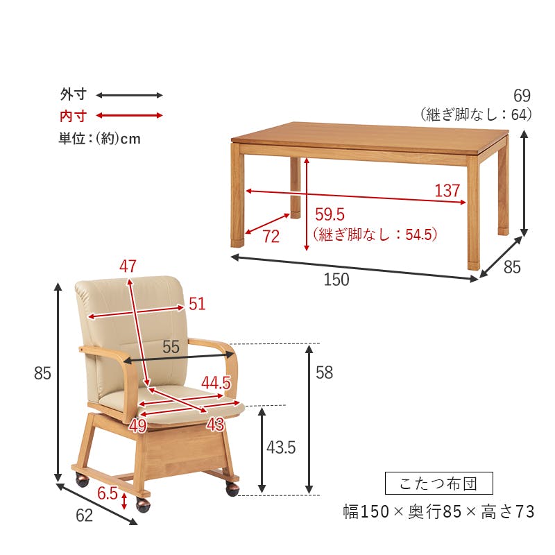 ■商品外寸サイズ:コタツ:(約)幅150×奥行85×高さ64/69cm、ふとん:(約)幅150×奥行85×高さ73cm、チェアー:(約)幅55×奥行62×高さ85×座面高43.5cm■内寸及び補足説明・組立式・ 天板固定ネジ付・ コード収納ボックス付・ 5cm継脚付