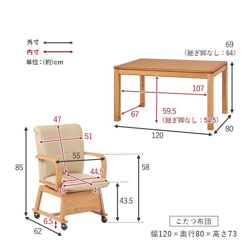 ■商品外寸サイズ:コタツ:(約)幅120×奥行80×高さ64/69cm、ふとん:(約)幅120×奥行80×高さ73cm、チェアー:(約)幅55×奥行62×高さ85×座面高43.5cm■内寸及び補足説明・組立式・ 天板固定ネジ付・ コード収納ボックス付・ 5cm継脚付