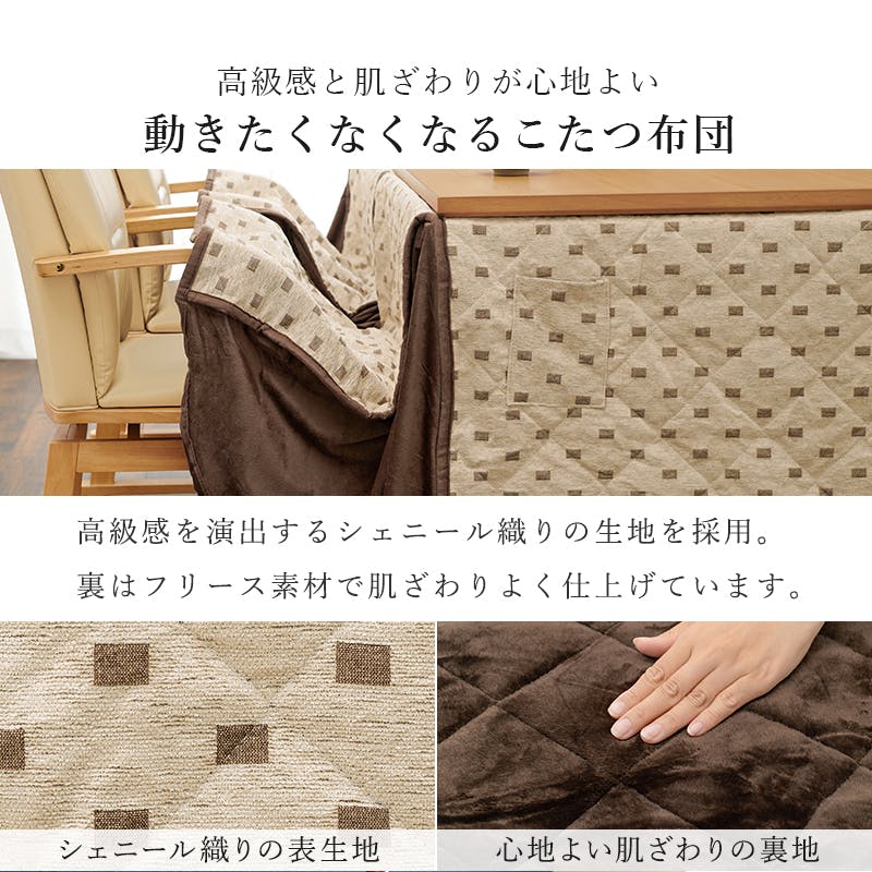 天板:<ブラウン>ウォールナット突板<ナチュラル>アッシュ突板、塗装:ウレタン樹脂塗装(UV加工) 、ヒーター:NN-8065 600W石英管ヒーター(手元コントローラー)、ふとん:<表地>ポリエステル75%・綿25%<裏地>ポリエステル、チェア:天然木、合成皮革、原産国:本体:マレーシア製、ヒーター:中国製、布団:中国製、チェア:タイ製
