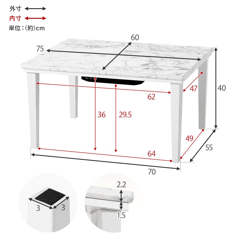 ■商品外寸サイズ:こたつ:(約)幅75×奥行60×高さ40cm、掛ふとん:(約)195×180cm■内寸及び補足説明・組立式