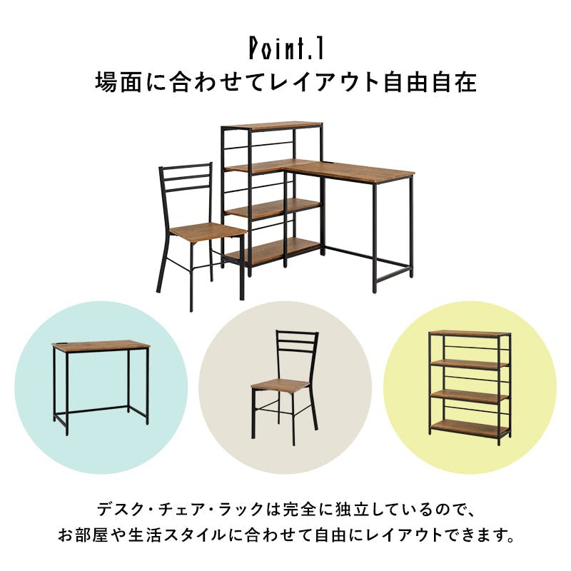 ■サイズ詳細:デスク:(約)幅80×奥行45×高さ72cm、チェア:(約)幅38.5×奥行45×高さ79.5×座面高42cm、ラック:(約)幅75×奥行30×高さ102cm