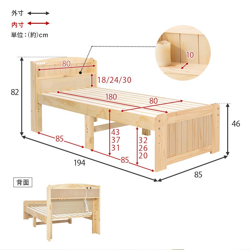 ■サイズ詳細:ベッド:(約)幅85×奥行194×高さ82×床面高31/37/43cm、マットレス:(約)幅80×奥行180×高さ16cm