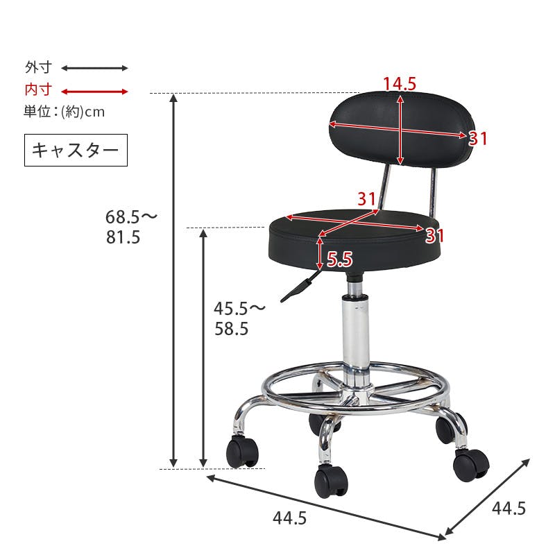 ■サイズ詳細:キャスター時:(約)幅44.5×奥行44.5×高さ68.5~81.5×座面高45.5~58.5cm、アジャスター時:(約)幅46×奥行46×高さ64.5~77.5×座面高41.5~54.5cm