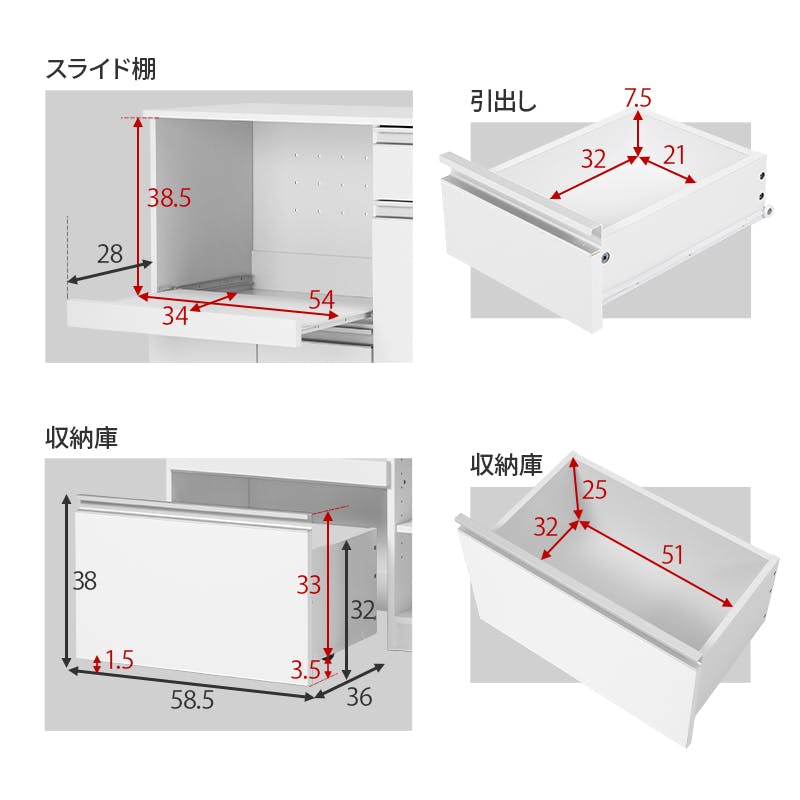 主材:プリント紙化粧パーティクルボード、天板・スライド棚:合成樹脂化粧パーティクルボード、取手:スチール ベトナム製