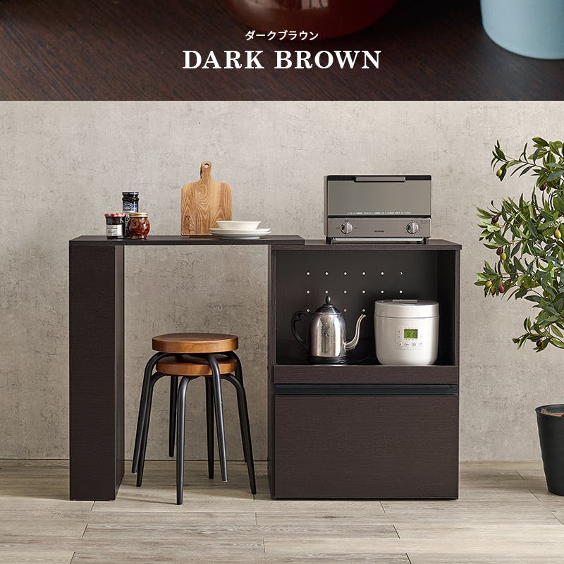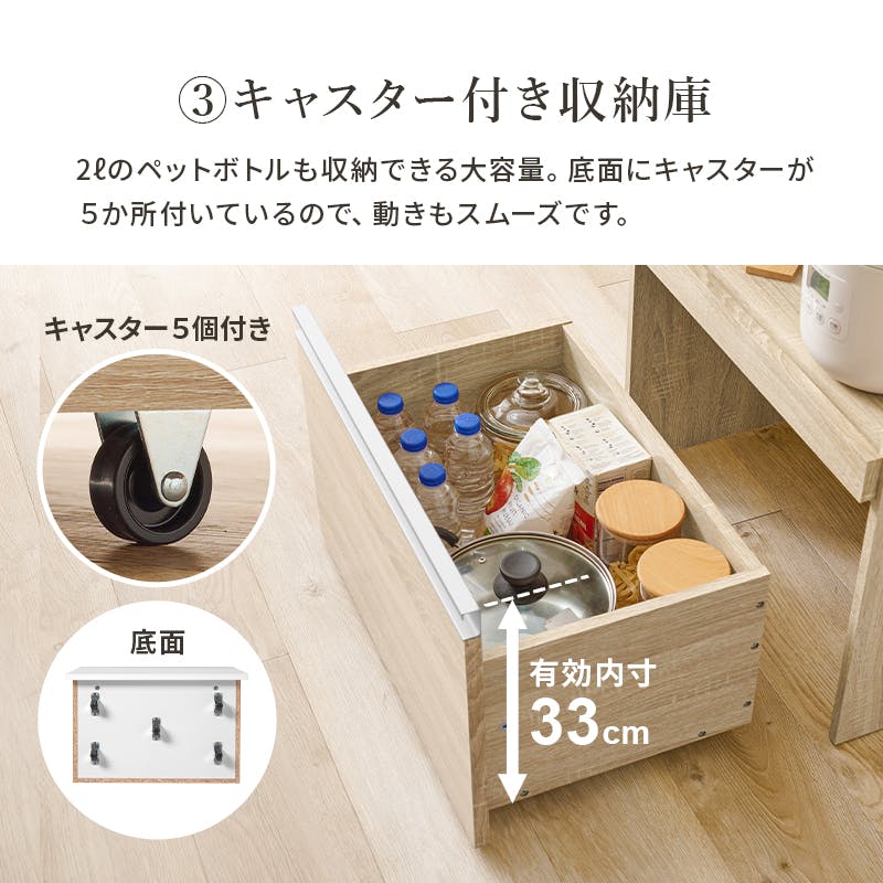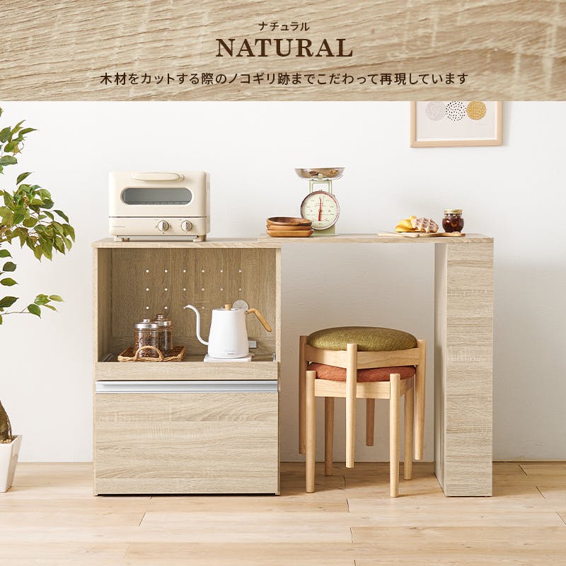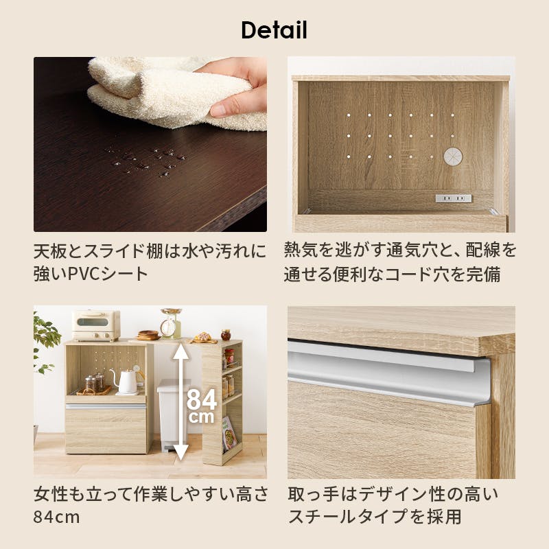 主材:プリント紙化粧パーティクルボード、天板・スライド棚:合成樹脂化粧パーティクルボード、取手:スチール ベトナム製
