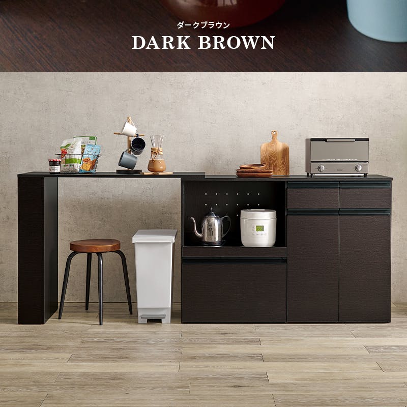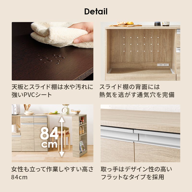 主材:プリント紙化粧パーティクルボード、天板・スライド棚:合成樹脂化粧パーティクルボード、取手:スチール ベトナム製