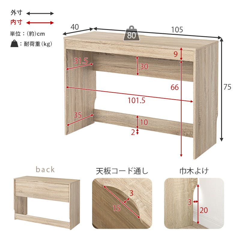 デスク:(約)幅105×奥行40×高さ75cm、ラック:(約)幅59×奥行35×高さ63.5cm、チェスト:(約)幅40×奥行35×高さ63.5cm