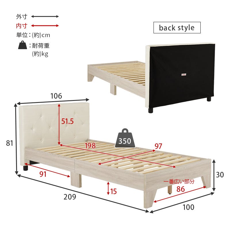 ベッド:(約)幅106×奥行209×高さ81×床面高29cm、マットレス:(約)幅97×奥行195×高さ20cm