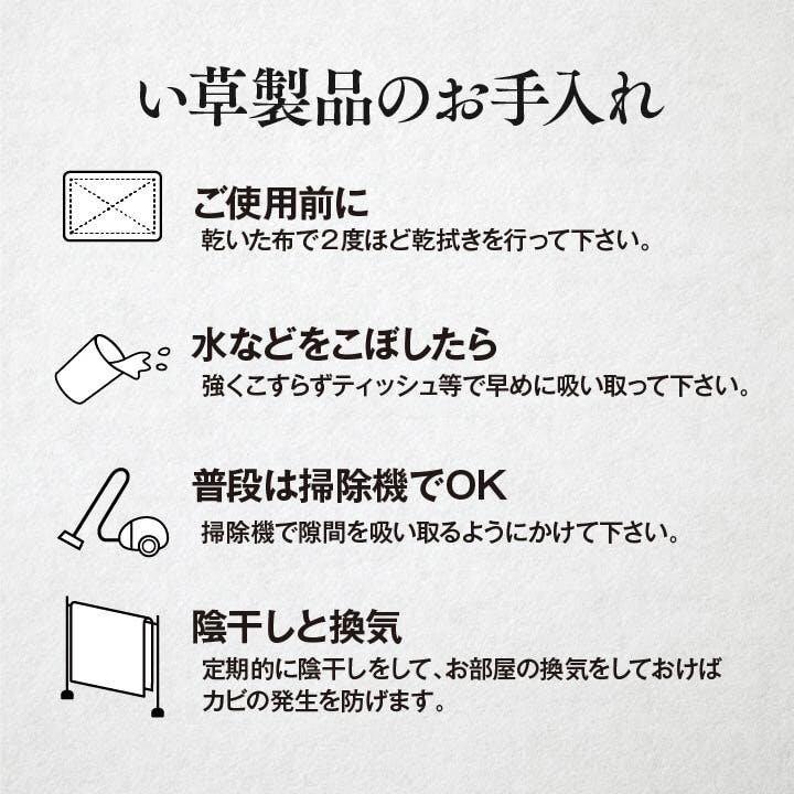 日焼けしてしまった畳のリフレッシュに、新品の畳を汚さない為のカバーにご使用下さい。天然素材のい草には、お部屋の空気をきれいにする空気清浄効果、お部屋の湿度を調整する調湿効果、汗臭、加齢臭、ペット臭などの嫌な臭いを消臭する消臭効果など優れた機能性があります。また抗菌防臭効果のあるヒバエッセンス加工をい草生地に施しています。