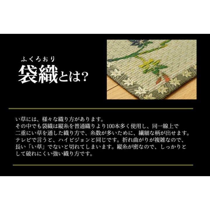ヘリにも紅葉柄をあしらい高級感を演出しました。縦糸の本数が多い袋織りという技法で繊細な柄を出しています。天然素材のい草には、お部屋の空気をきれいにする空気清浄効果、お部屋の湿度を調整する調湿効果、汗臭、加齢臭、ペット臭などの嫌な臭いを消臭する消臭効果など優れた機能性があります。また抗菌防臭効果のあるヒバエッセンス加工をい草生地に施しています。