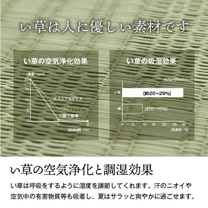 弾力性と耐久性に優れた国産(九州産)のい草を使用しています。天然素材のい草には、お部屋の空気をきれいにする空気清浄効果、お部屋の湿度を調整する調湿効果、汗臭、加齢臭、ペット臭などの嫌な臭いを消臭する消臭効果など優れた機能性があります。また抗菌防臭効果のあるヒバエッセンス加工をい草生地に施しています。